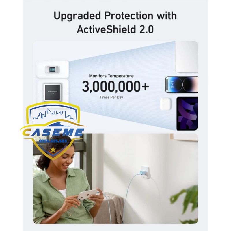 Đủ mạnh để sạc MacBook Air M1/M2. Ngoài ra, sạc còn dùng tốt cho iPhone 8 trở lên, iPhone 15 series, iPad, Galaxy S, Note series, tai nghe, Nintendo Switch (chế độ cầm tay). An toàn với ActiveShield 2.0 Củ sạc tích hợp công nghệ ActiveShield 2.0. Hệ thống này theo dõi nhiệt độ tới 3 triệu lần/ngày. Nhờ vậy, thiết bị luôn được bảo vệ khỏi quá nhiệt, quá tải hay đoản mạch. Ưu điểm nổi bật so với sạc thường
