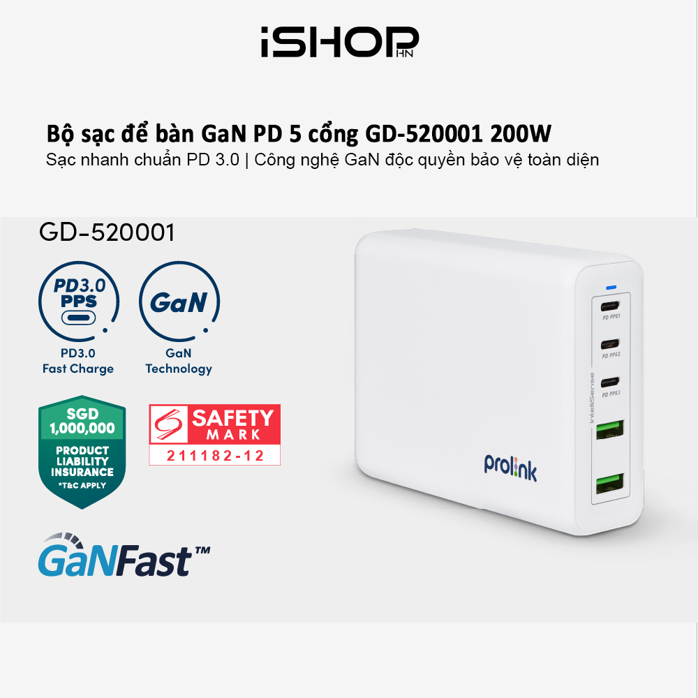 Bộ sạc máy tính để bàn GaN PD 5 cổng GD-520001 200W thể hiện sức mạnh của mình bằng cách kết hợp công nghệ GaN mới nhất cùng với công nghệ IntelliSense của riêng Prolink, không chỉ mang lại nguồn sạc tuyệt vời cho thiết bị của bạn mà còn mang đến sự yên tâm cho người dùng.