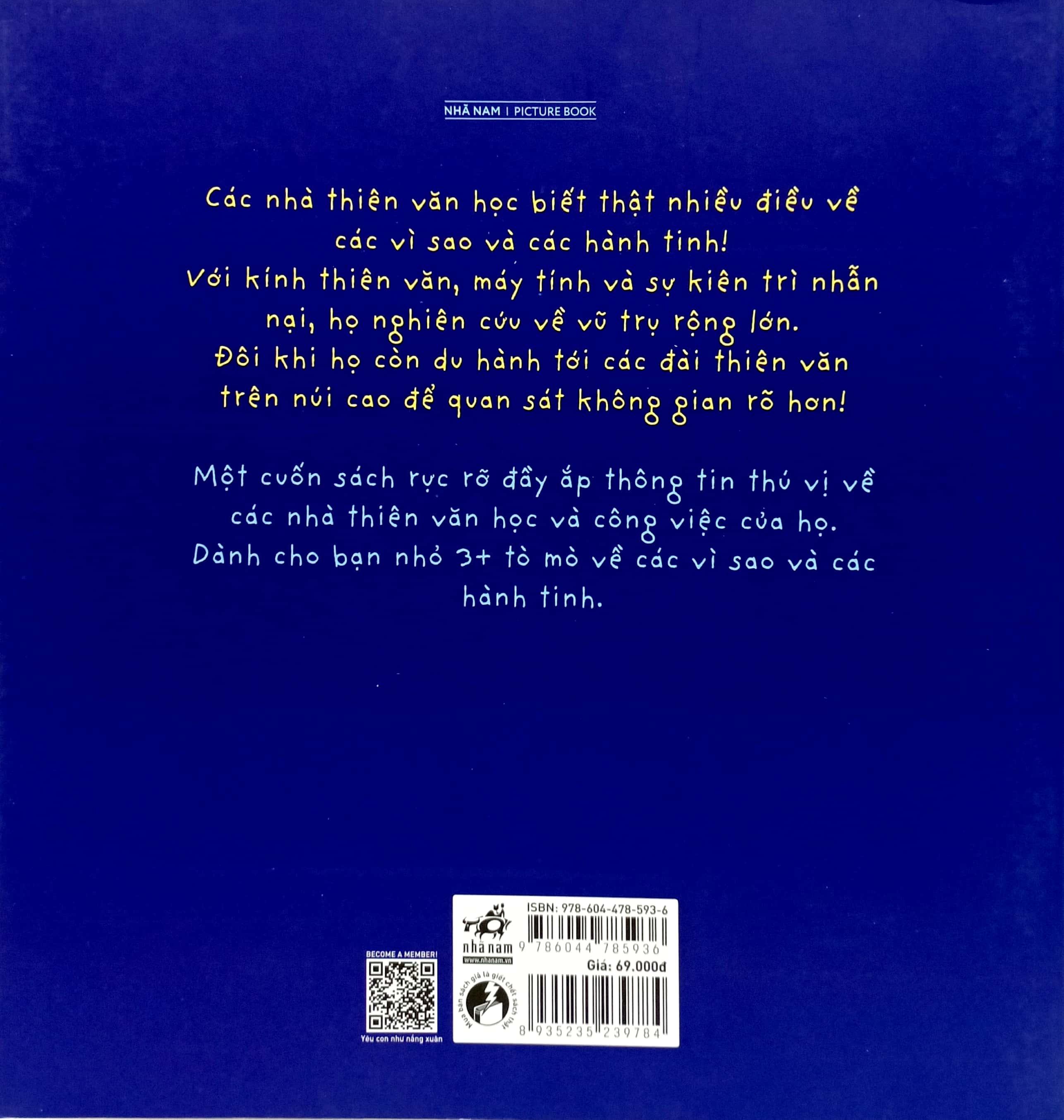 Cuốn Sách Lớn Rực Rỡ Về - Nhà Thiên Văn Học (Kèm Từ Vựng Song Ngữ) Các nhà thiên văn học biết thật nhiều điều về các vì sao và các hành tinh! Với kính thiên văn, máy tính và sự kiên trì nhẫn nại, họ nghiên cứu về vũ trụ rộng lớn. Đôi khi họ còn du hành tới các đài thiên văn trên núi cao để quan sát không gian rõ hơn! Một cuốn sách rực rỡ đầy ắp thông tin thú vị về các nhà thiên văn học và công việc của họ. Dành cho bạn nhỏ 3+ tò mò về các vì sao và các hành tinh.