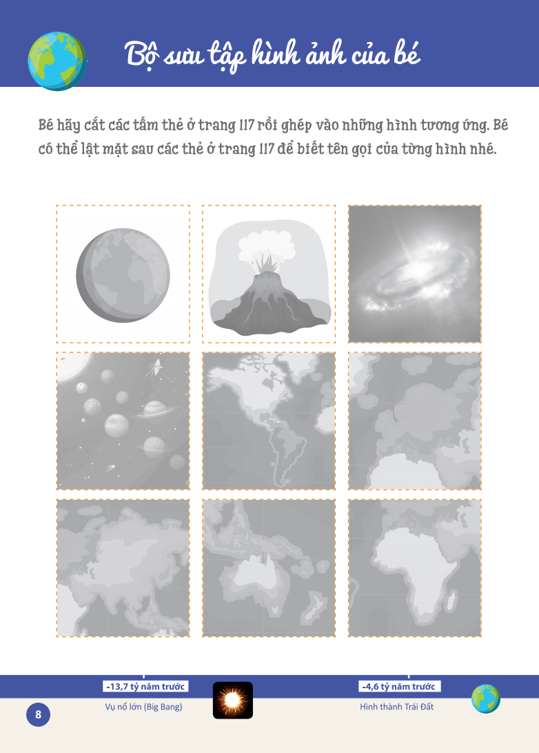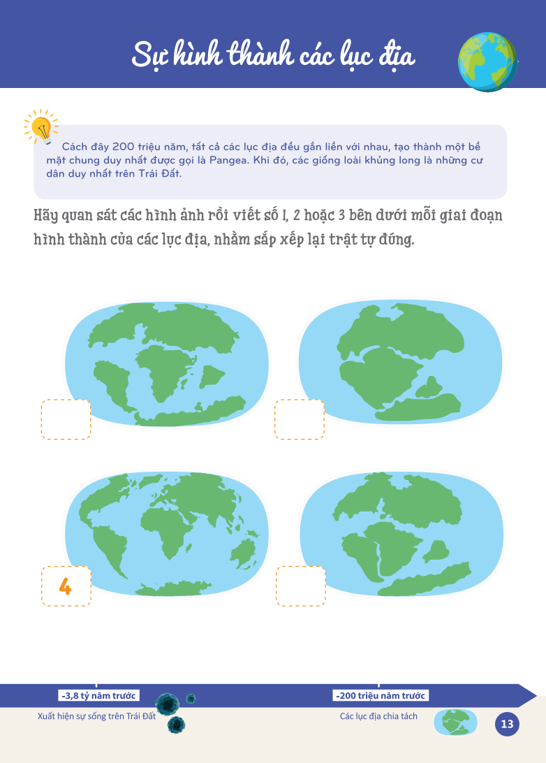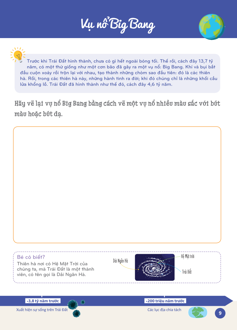 - Mỗi giai đoạn lịch sử (hình thành Trái Đất, thời Tiền sử, thời cổ đại, thời Trung cổ, thời Hiện đạ) sẽ được giới thiệu thông qua hoạt động khám phá, tiếp đến các trò chơi nhằm giúp trẻ hiểu biết thêm về giai đoạn đó cùng những sự kiện then chốt (dựng lại phân cảnh, sắp xếp hình ảnh, vẽ lại những chuyến đi trên bản đồ, ). Các chi tiết có thể cắt ra ở phẩn cuối sách sẽ giúp trẻ ghi nhớ dễ dàng hơn.