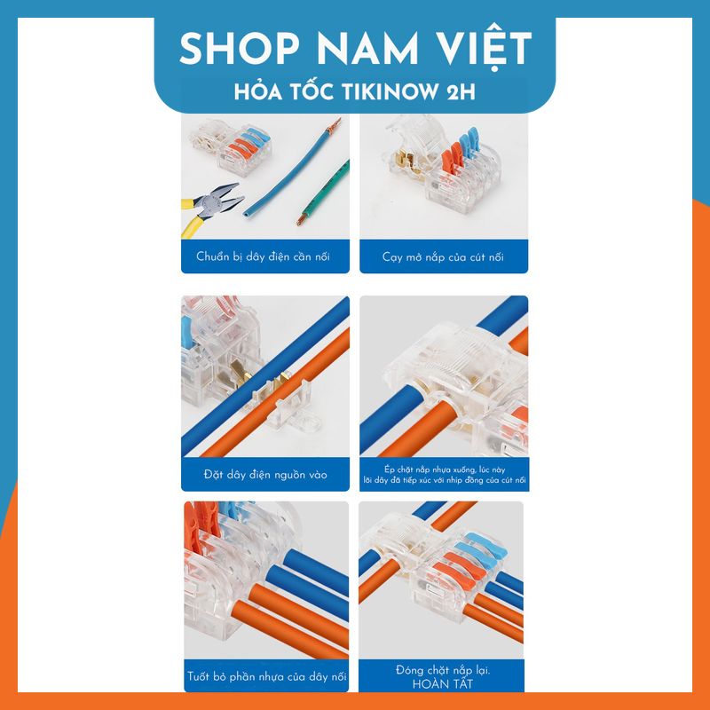 - Không cần quan tâm phải nối hay quấn dây điện với nhau đúng cách thế nào. Chỉ việc ấn các dây điện vào cút nối và đóng cần cố định - Không cần phải quấn
