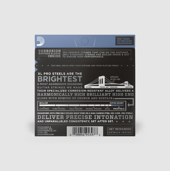 D'Addario EPS510 ProSteels Electric Guitar Strings, Regular Light, 10-46 D'Addario XL ProSteels sử dụng hợp kim thép không gỉ độc quyền cho âm sắc siêu sáng mà không bị overtones chát tai. Tạo được âm