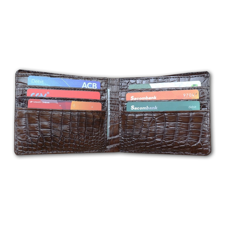- Ví nam được làm bằng chất liệu da cá sấu cao cấp tạo kiểu dáng lạ mắt, sang trọng. - Thiết kế nhỏ gọn, thời trang, dạng ví nam xếp đôi, có nhiều ngăn