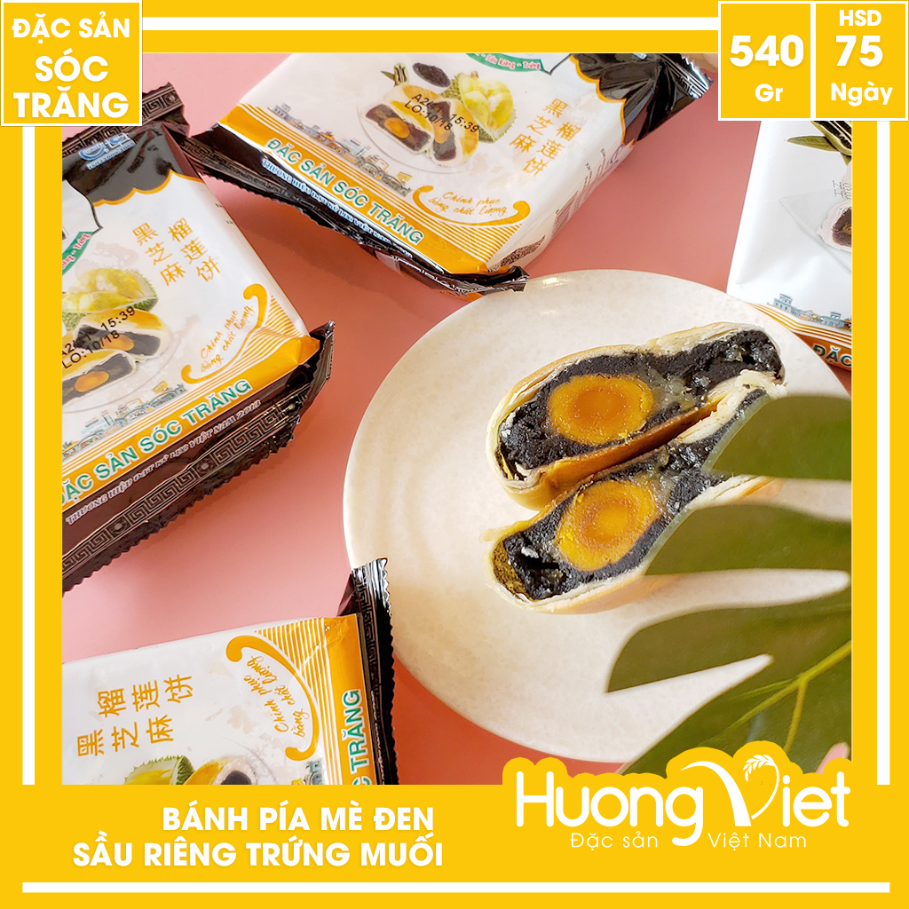 Bánh pía mè đen sầu riêng trứng muối 540g Nhân bánh được làm từ mè đen, sầu riêng, trứng muối, mang đến một hương vị mới lạ cho người tiêu dùng nhưng vẫn mang đậm