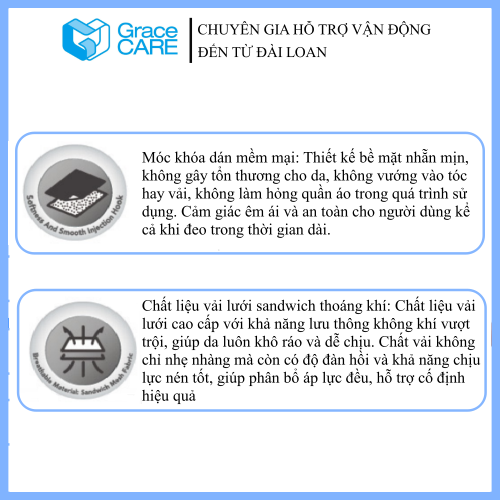 Thương hiệu: Grace Care - Nhà cung cấp chuyên nghiệp các sản phẩm chỉnh hình, bảo hộ thể thao tại Đài Loan. Sản xuất: Đài Loan Sản phẩm đạt tiêu chuẩn y tế ISO 13485 Đơn vị bán: Cái Size: S / M / L / XL Chất liệu: Polyester, Steel, Rubber, Nylon, Polypropylene