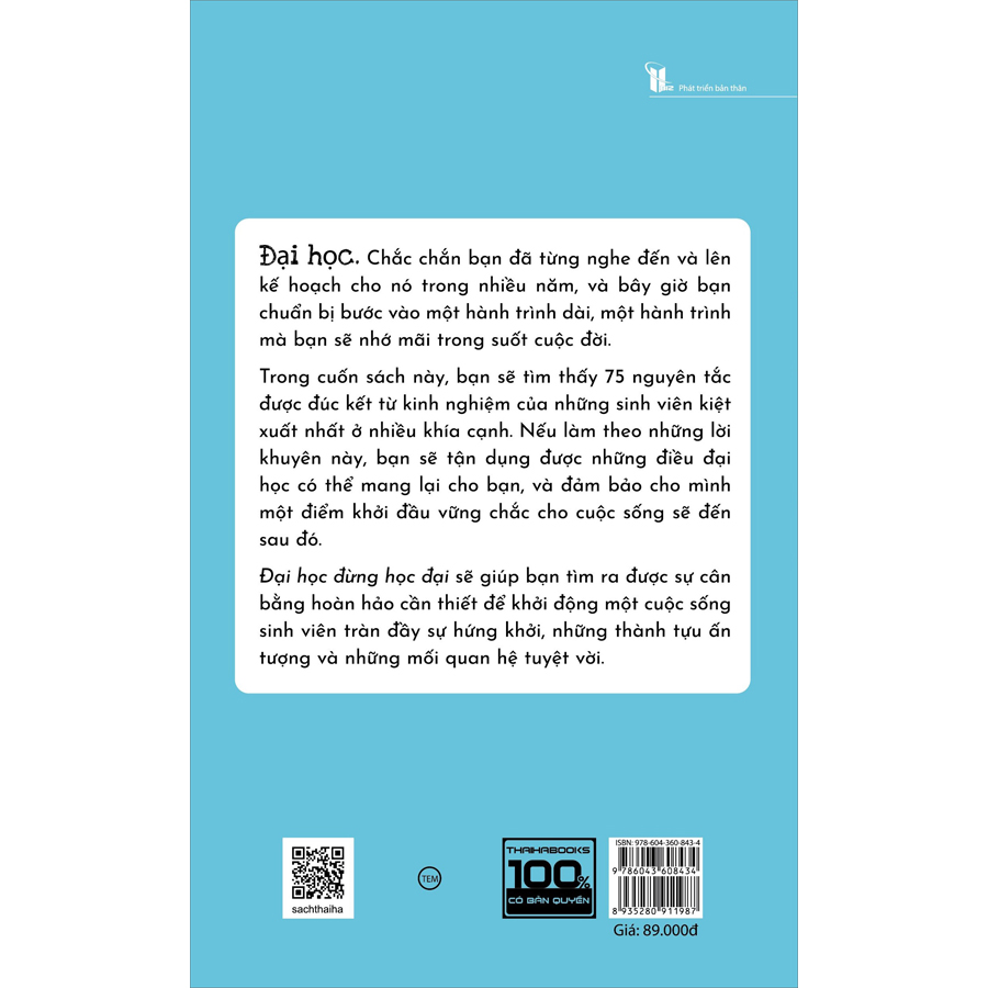 Đại học. Chắc chắn bạn đã từng nghe đến và lên kế hoạch cho nó trong nhiều năm, và bây giờ bạn chuẩn bị bước vào một hành trình dài, một hành trình mà bạn sẽ nhớ mãi trong suốt cuộc đời. Trong cuốn sách này, bạn sẽ tìm thấy 75 nguyên tắc được đúc kết từ kinh nghiệm của những sinh viên kiệt xuất nhất ở nhiều khía cạnh. Nếu làm theo những lời khuyên này, bạn sẽ tận dụng được những điều đại học có thể mang lại cho bạn, và đảm bảo cho mình một điểm khởi đầu vững chắc cho cuộc sống sẽ đến sau đó. Đại học đừng học đại sẽ giúp bạn tìm ra được sự cân bằng hoàn hảo cần thiết để khởi động một cuộc sống sinh viên tràn đầy sự hứng khởi, những thành tựu ấn tượng và những mối quan hệ tuyệt vời. “Tất cả sinh viên, và tất cả cha mẹ của sinh viên, cần phải mua cuốn sách này.”