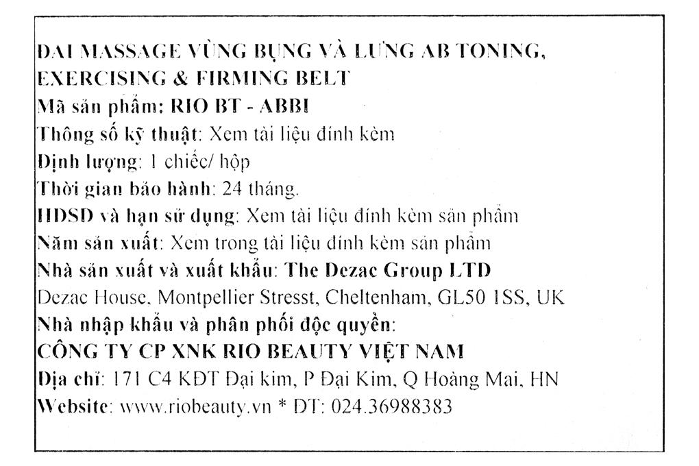 Đai massage bụng Rio BT-ABBI-PU dành cho vùng bụng và lưng giúp làm săn chắc cơ bụng và đai thắt lưng, sự lựa chọn hoàn hảo cho người sử dụng.