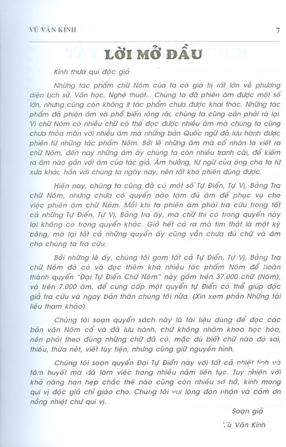 Soạn giả Vũ Văn Kính là một trong những cây đại thụ hiếm hoi còn sót lại của thế hệ đi trước. Với tâm nguyện và nhiệt tình đóng góp cho văn hóa nước nhà, sau khi đã hưu trí từ Viện Khoa học Xã hội, ông vẫn tiếp tục công việc nghiên cứu và cho ra đời nhiều công trình quan trọng, trong đó có bộ tự điển chữ Nôm này.