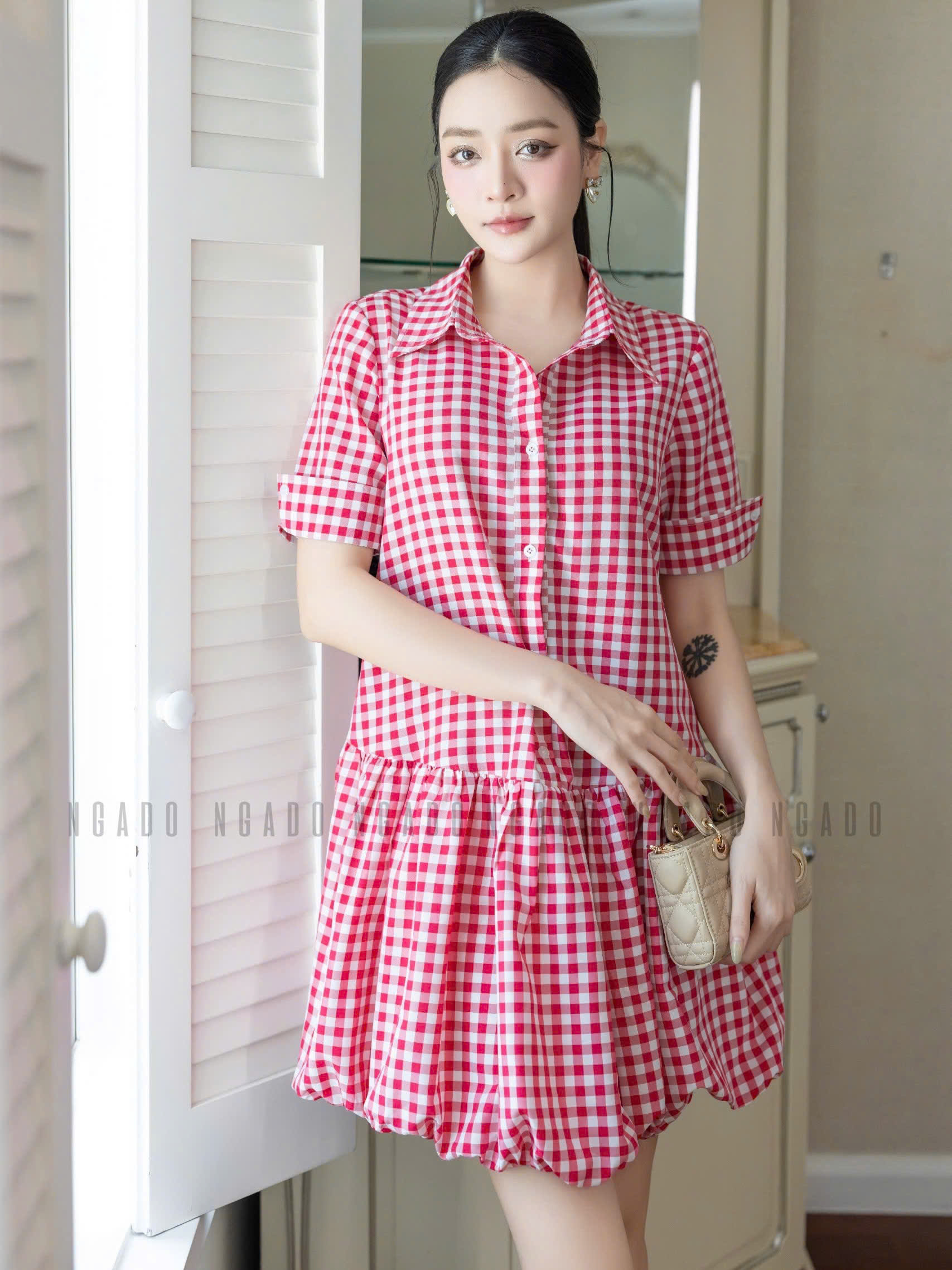 ✨Đầm babydoll caro đỏ cổ sơ mi NGADO , đầm caro , đầm Nữ