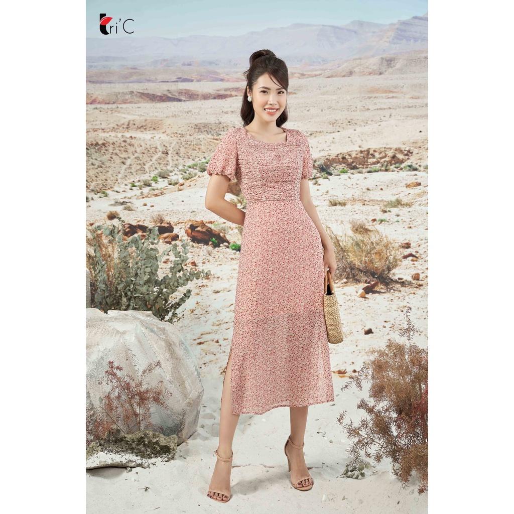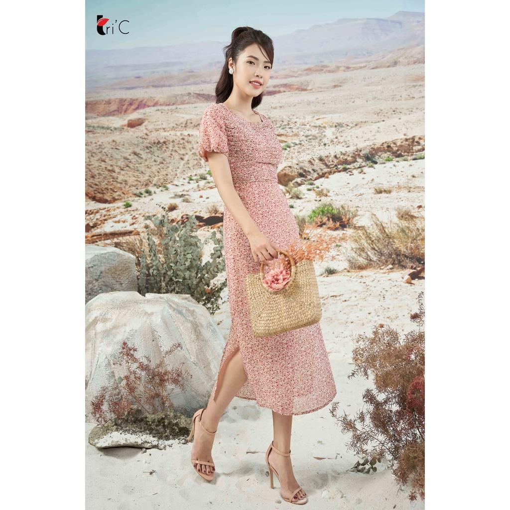 ✨Đầm maxi hoa nhí, cổ vuông rút dúm trước Tri'C Luxury A24021 Hồng