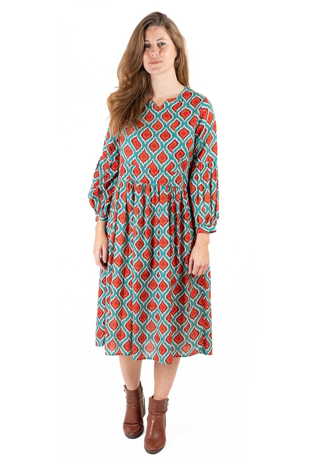 Maxi Boho Dài Tay Kết Cườm Cotton Isla Bonita, chất liệu cotton cao cấp, mềm mại, nổi bật phần ngực trước kết cườm sang trọng. Họa tiết thổ cẩm độc đáo. Phom suông. Dài Đầm