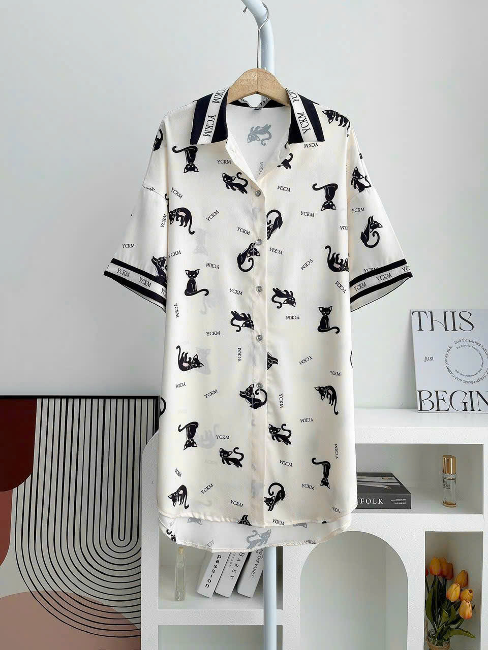 Áo ngủ lụa pijama họa tiết môi tím sang chảnh, thời thượng - Màu sắc: trắng - tím - Chất liệu: lụa satin Đặc điểm nổi bật: Áo ngủ lụa cổ trụ Pijama, tay dài phối viền