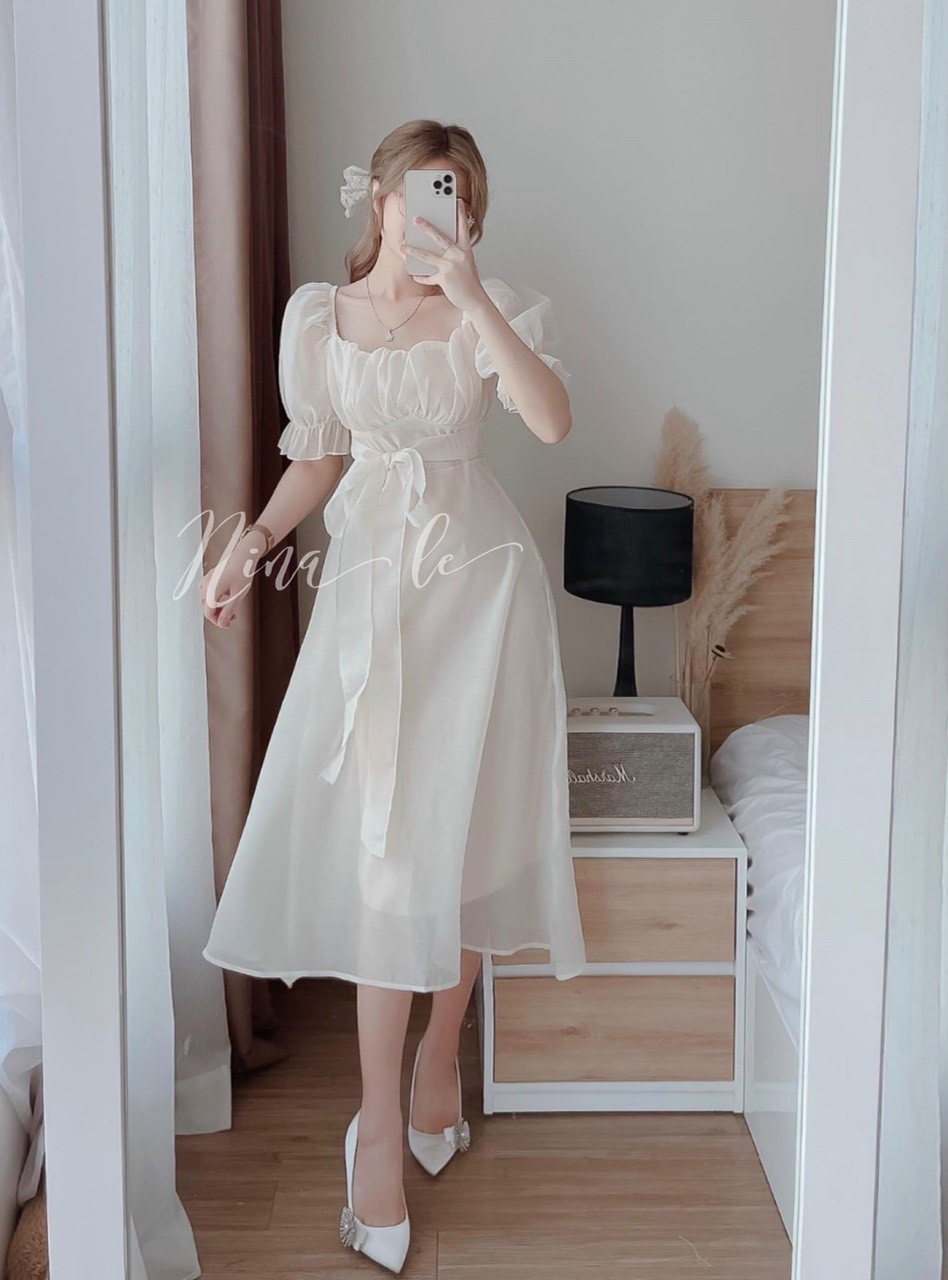 D4980] Váy thiết kế ren cúc bọc tay bồng pha chân tơ dáng dài Shop về 2 size S.M 2 màu trắng và kem Sản phẩm này là tài sản cá nhân được bán bởi