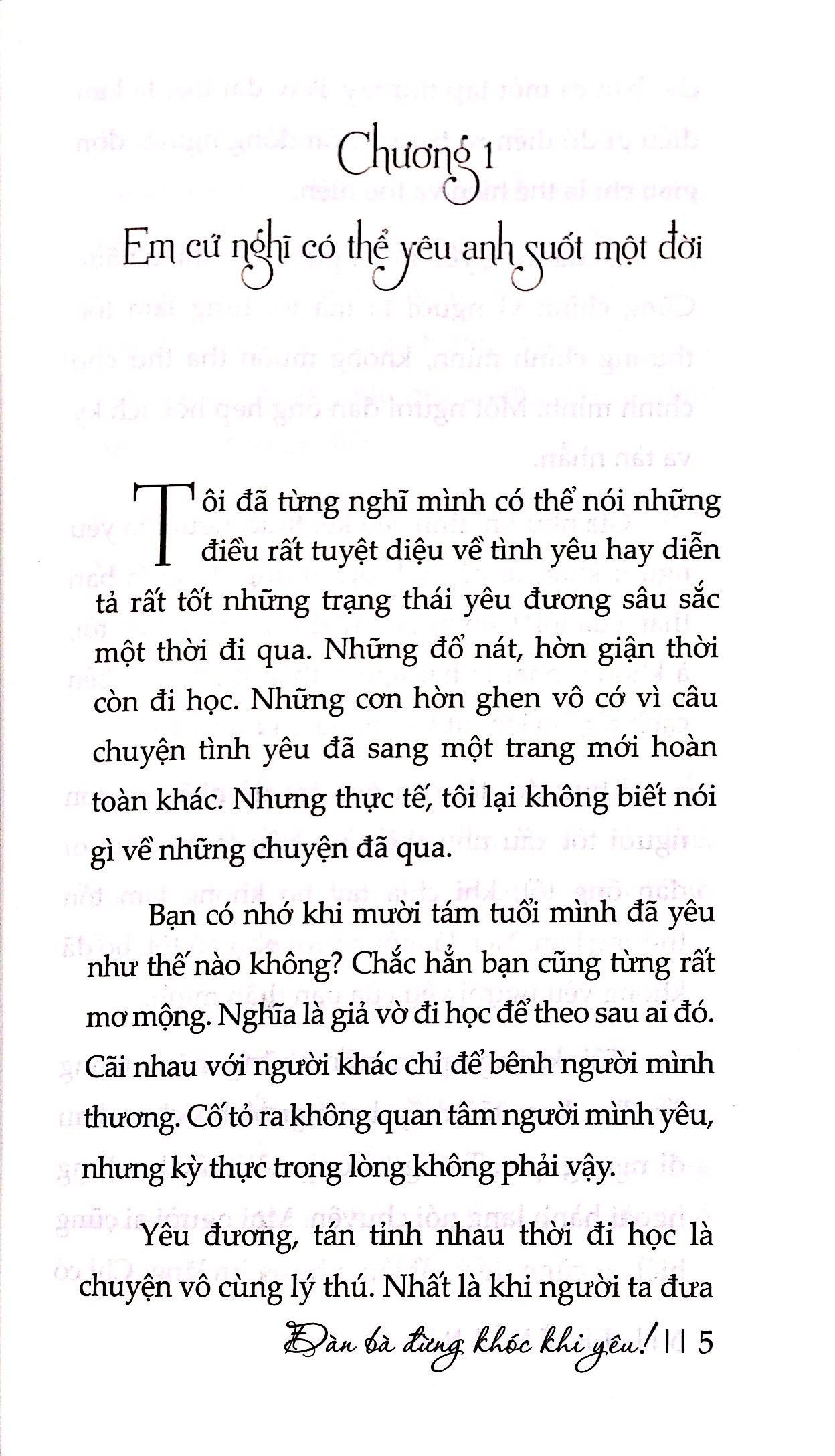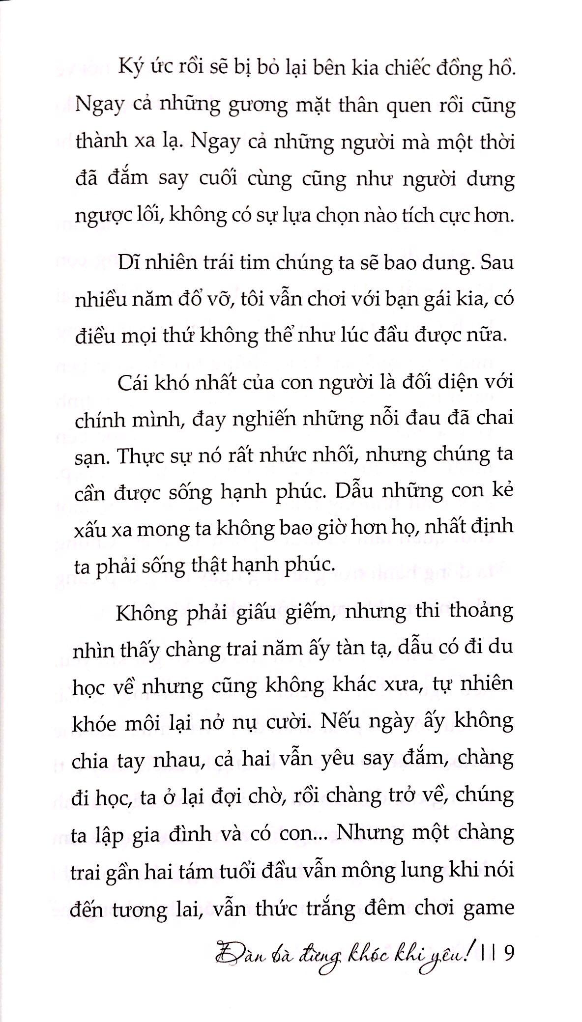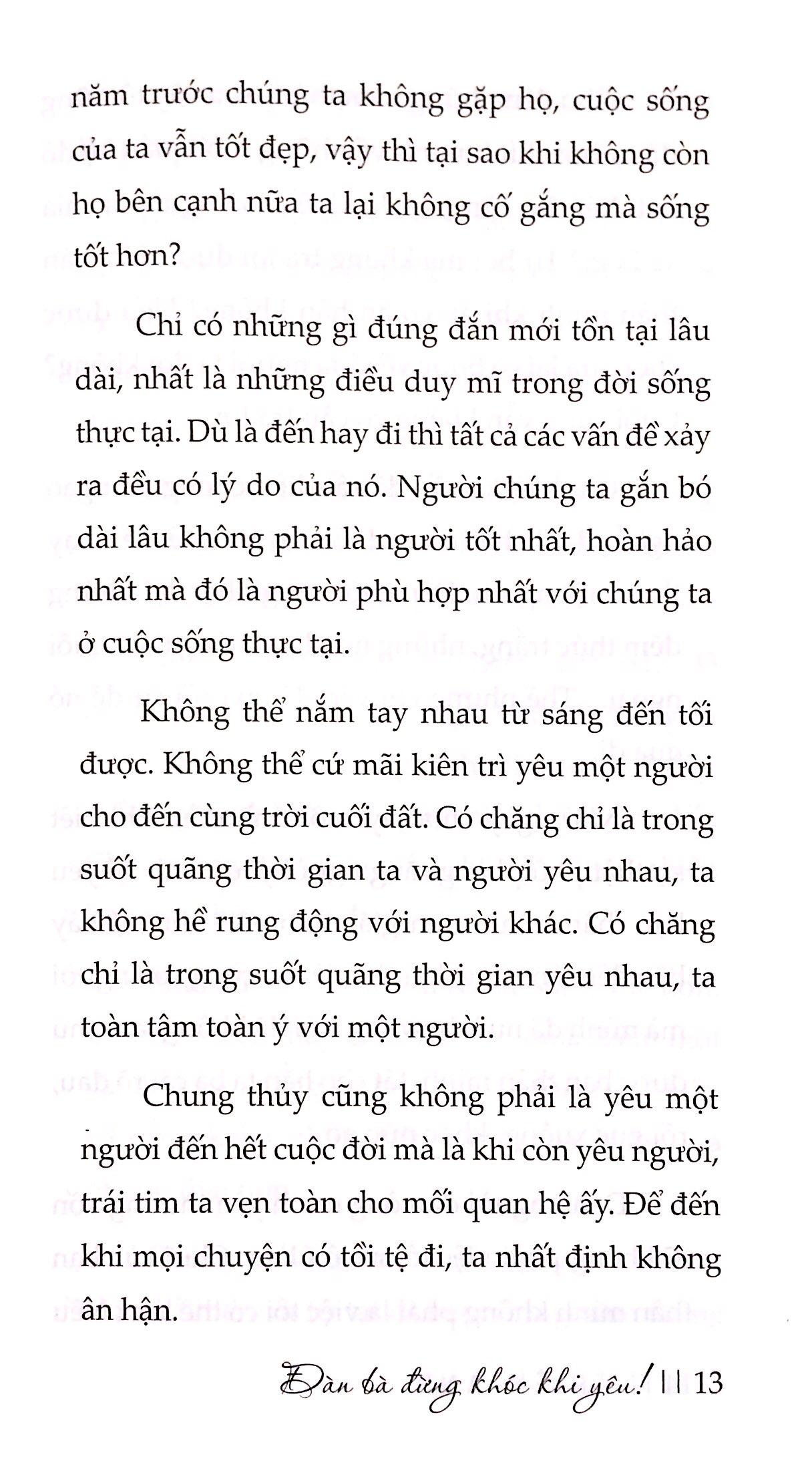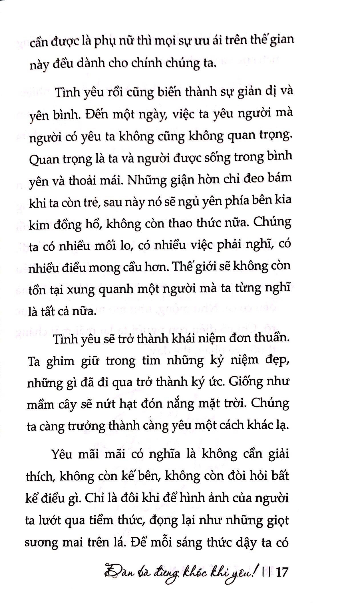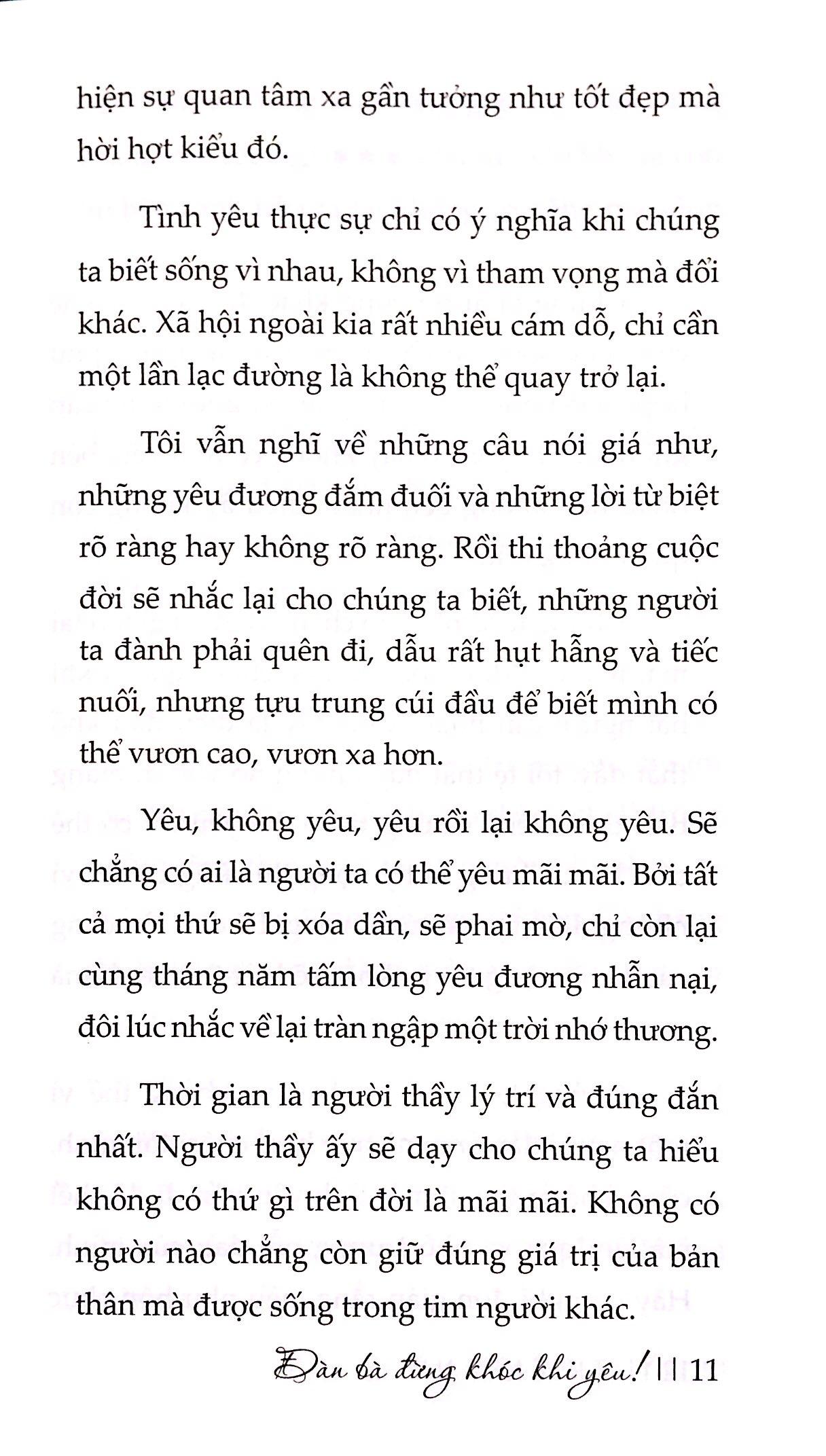 Đàn bà, hãy tỉnh táo, đừng lúc nào cũng chỉ biết khóc. Nước mắt không làm chúng ta bớt đau, nước mắt làm những vết thương thêm đau. Đến một thời điểm nào đó chúng ta sẽ không còn quan trọng trong mắt người đàn ông của mình. Thậm chí dù có chu toàn tâm nguyện một đời chưa chắc người ta đã biết mà thấu cảm. Vậy nên hết lòng sống ở giây phút ấy, hết lòng mà đốt cháy thanh xuân của mình, không bao giờ phải ân hận, xót xa.