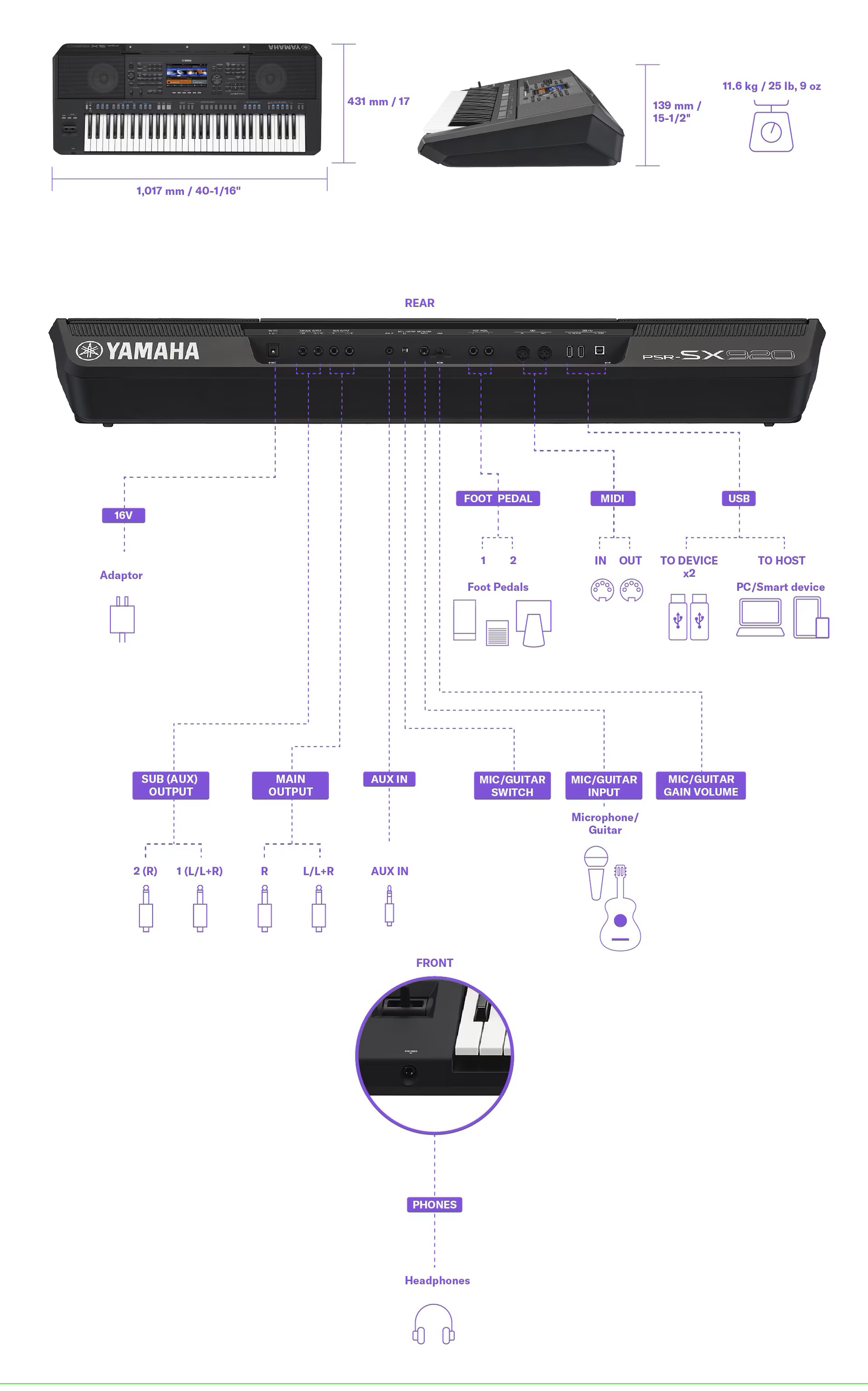 Thông Số kỹ Thuật : Yamaha PSR-SX600 61 phím với phím cảm ứng thế hệ mới. Với 850 Voices , 43 Drum/SFX Kits , 480 XG Voices, 415 Styles, 128 Polyphony Màn hình màu