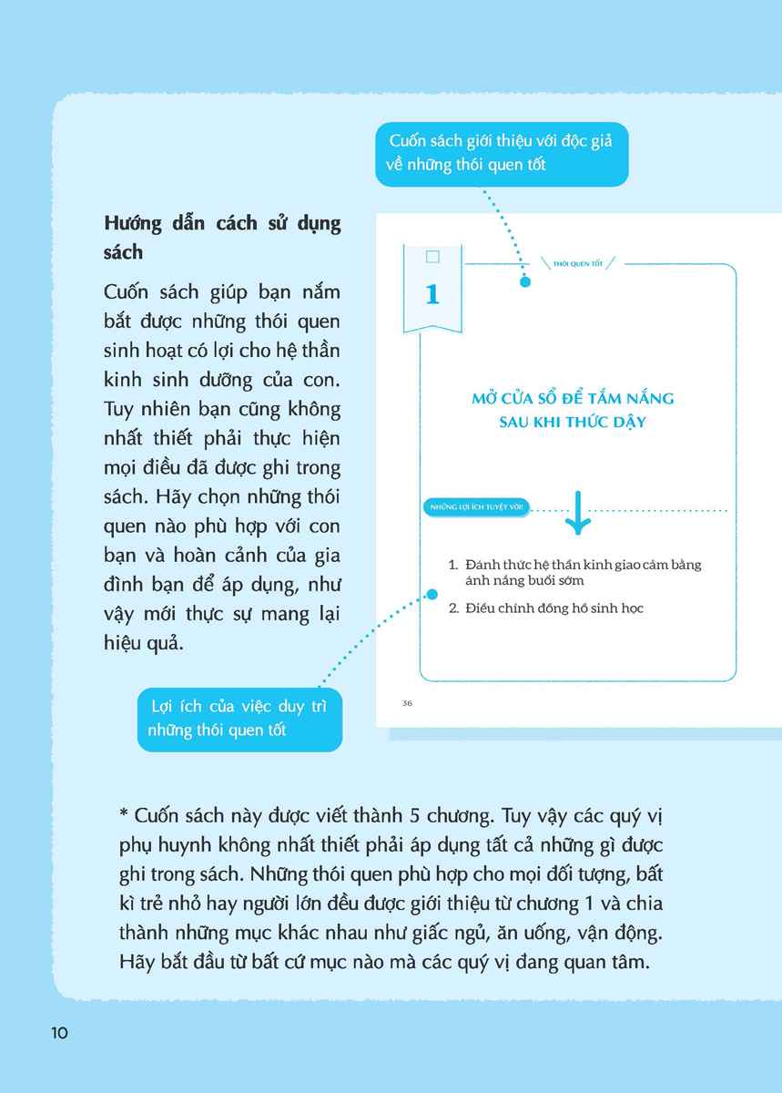 Cuốn sách gồm 6 chương, chương mở đầu giới thiệu với người đọc về hệ thần kinh sinh dưỡng, tầm quan trọng của hệ thần kinh này đối với sức khỏe con người, đặc biệt là với trẻ nhỏ. Năm chương tiếp theo lần lượt giới thiệu từ 1 đến 62 thói quen tốt, có ích cho hệ thần kinh sinh dưỡng ở trẻ. Cha mẹ có thể tham khảo và dễ dàng áp dụng cho con mình. Đặc biệt, Chương 4 của cuốn sách giới thiệu13 thói quen vận động giúp trẻ rèn luyện hệ thần kinh sinh dưỡng theo cách khoa học, hiệu quả nhất. Trong đó, nhóm tác giả chỉ ra rằng ít vận động cũng là một trong những nguyên nhân khiến cho hệ thần kinh sinh dưỡng ở trẻ hoạt động kém đi. Bởi vậy, cha mẹ hãy cùng trẻ tham khảo kĩ những thói quen tốt này và thực hành vận động cơ thể ngay từ hôm nay.