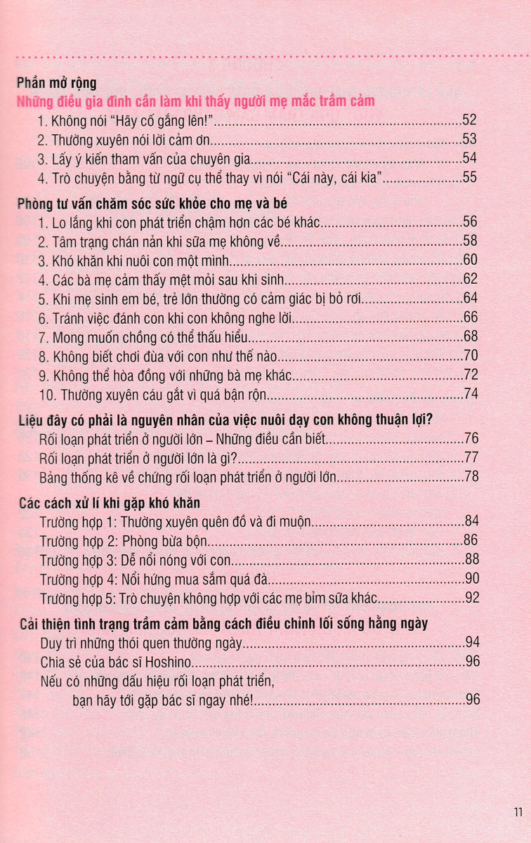 Cụ thể, Chương 2 có chủ đề Vượt qua trầm cảm bằng hành động, do bác sĩ Ono biên soạn. Chương 3: Vượt qua trầm cảm bằng giấc ngủ, do chuyên gia tư vấn về giấc ngủ Aiba Aya biên soạn. Chương 4: Chế độ ăn giúp cải thiện chứng trầm cảm, do Hosokawa Momo, chuyên gia tư vấn về sức khỏe mẹ và bé biên soạn.