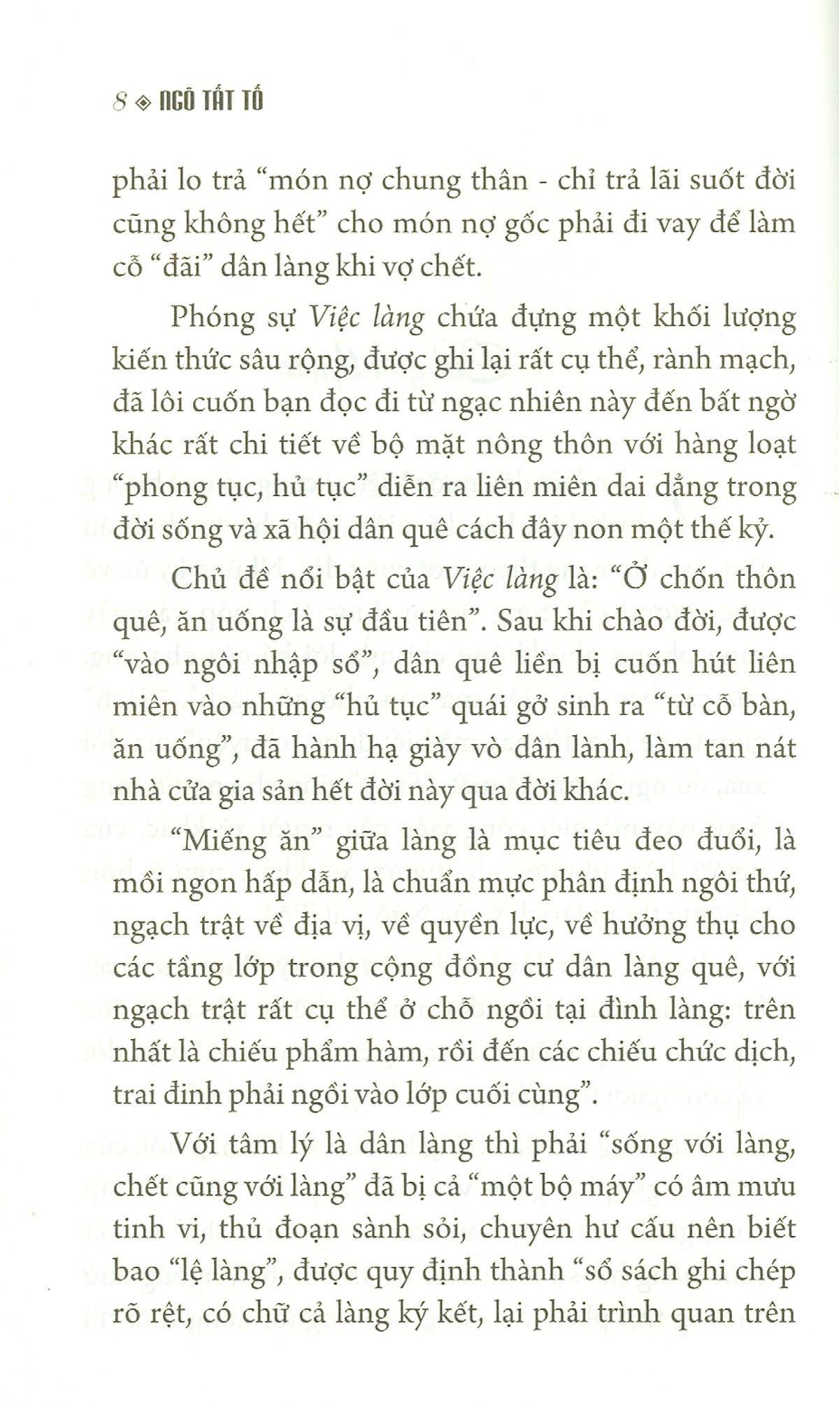 Phóng sự việc làng chứa đựng một khối lượng kiến thức sâu rộng, được ghi lại rất cụ thể, rành mạch, đã lôi cuốn bạn đọc đi từ ngạc nhiên này đến bất ngờ khác rất chi tiết về bộ mặt nông thôn với hàng loạt phong tục, hủ tục diễn ra liên miên dai dẳng trong đời sống và xã hội dân quê cách đây non một thế kỷ.