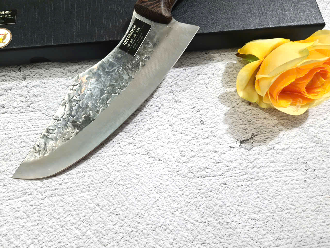 -THÔNG TIN SẢN PHẨM: Chiều dài tổng thể: 29.5cm, Chiều dài lưỡi: 19.5cm ,Chiều rộng lưỡi: 5cm Độ dày: 2.5MM, CHẤT liệu lưỡi: 5Cr15MOV (thép 5 crom 15 molypden vanadi) Chất liệu CÁN: gỗ Cánh gà NẶNG : 2.5 lạng Mặt D dập chìm hoa văn rất đẹp