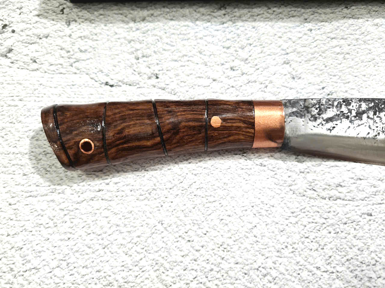 Cán gỗ cẩm chỉ núi đá kết hợp với khâu đồng đỏ được chốt đinh tán và keo liên kết đảm bảo độ bền chắc.