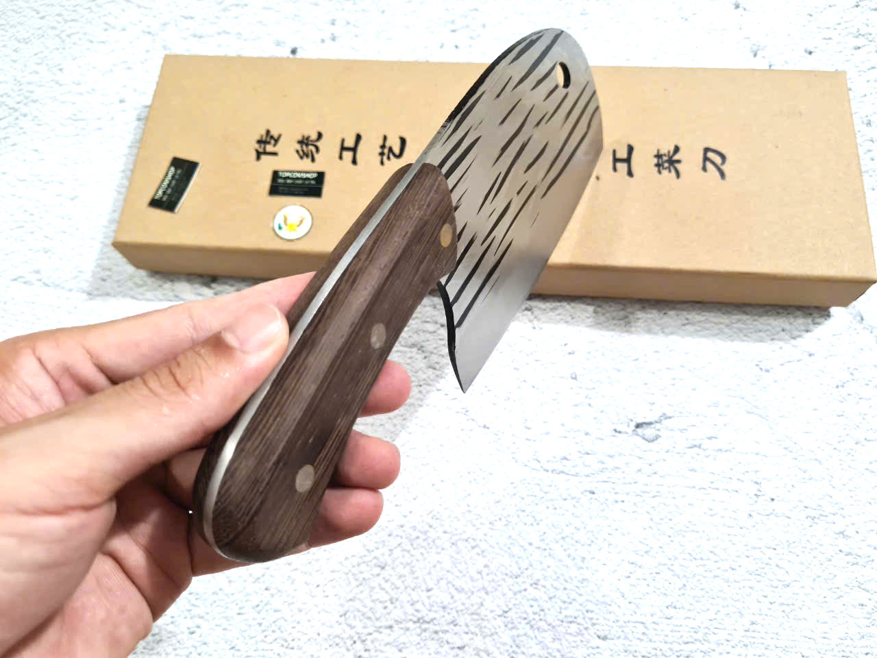 - Chức năng: Chặt xương ống, chân giò, trâu bò - Kích thước: Lưỡi: 22cm, cán: 10cm, rộng: 10cm, dầy: 5ly, trọng lượng: 800g - Cán : Gỗ mun, Khâu đồng đỏ , chốt đinh