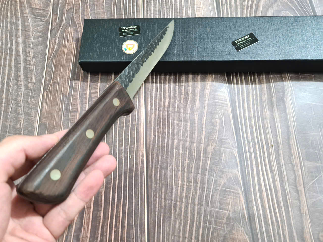 • Chất liệu: Thép Nhật 420J2, độ cứng 53HRC – siêu bền, chống gỉ • Lưỡi dao: Dày 2.5mm, sắc bén, hoàn thiện bằng đá mài nước • Tay cầm: Gỗ Pakka sang trọng, chống