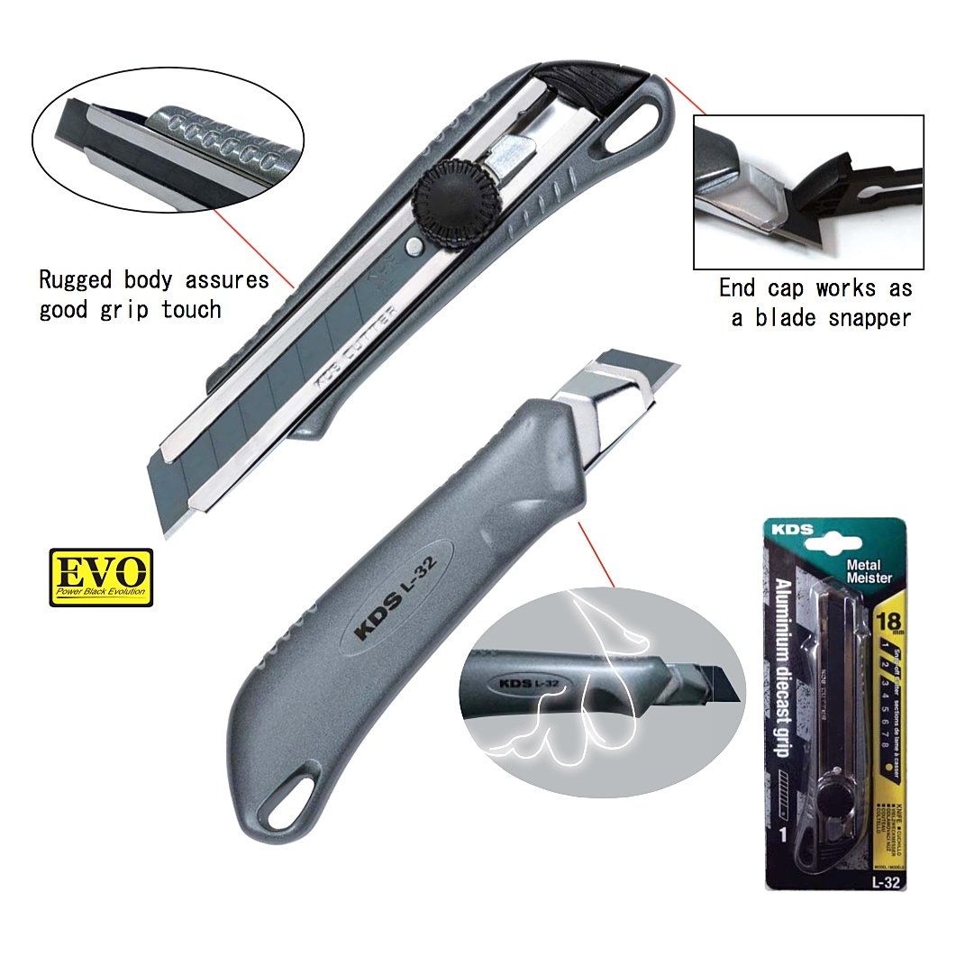 • Dao rọc giấy kim loại KDS L-32 có thể cắt được giấy, bìa carton mỏng và mica mỏng…rất thích hợp cho mọi người, gia đình, học tập, nhà máy, xí nghiệp....