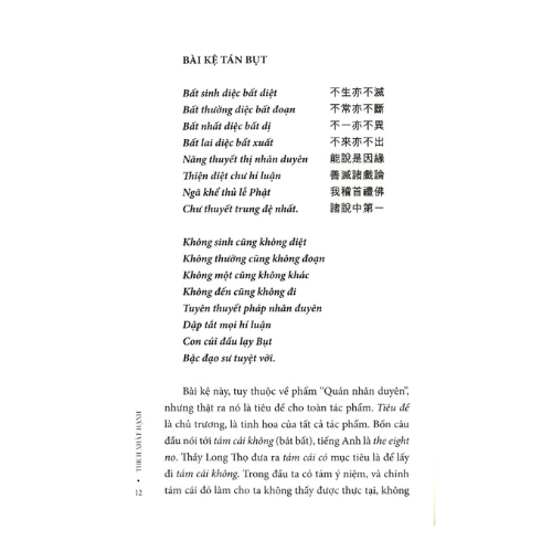 Bồ tát Long Thọ ra đời khi các cánh cửa của Phật giáo Đại thừa được bắt đầu mở rộng. Long Thọ thừa hưởng không gian khoáng đạt do các cánh cửa ấy cung cấp và vì vậy đã có khả năng khám phá trong kinh điển Phật giáo những viên bảo châu sáng ngời bị chôn lấp trong nền văn học Nikaya. Long Thọ nắm được cái tinh hoa của phương pháp học Phật giáo: loại bỏ được cái nhìn nhị nguyên để giúp tiếp xúc được với thực tại, một thứ thực tại bất khả đắc đối với những ai còn kẹt vào những phạm trù của khái niệm. Khoa học còn đang vùng vẫy để thoát ra khỏi cái nhìn nhị nguyên ấy: sinh-diệt, có-không, thành-hoại, tới-đi, trong-ngoài, chủ thể và đối tượng…