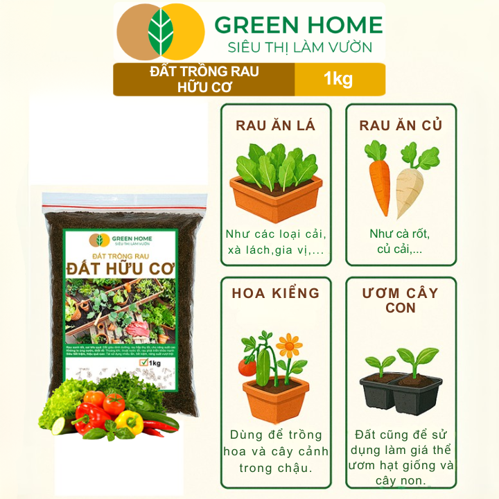 Mua tại TiktokGIÁ SỈ SIÊU LỢI: Bao 1kg Giá chỉ còn 12,500đ Số lượng: 100 bao Giá chỉ còn 14.000đ Số lượng: 50 bao Đất Trồng Rau Greenhome, Hữu Cơ, Trộn Sẵn, Tiện Lợi, Đầy Đủ Dinh Dưỡng, Chuyên Cho Rau, Củ, Quả ĐẶC ĐIỂM NỔI BẬT -Đất có độ tơi xốp, phì nhiêu cao, kết hợp cân đối giữa khả năng thông thoáng và giữ ẩm cao -Giữ ẩm tốt -Giàu dinh dưỡng -Thoáng khí, thoát nước tốt -Đã xử lý tiệt trùng và kháng bệnh -Nguyên liệu đầu vào được tuyển chọn và xử lý kỹ lưỡng -Phù hợp với môi trường phát triển đô thị Đất trồng rau Organic có độ tơi xốp, phì nhiêu cao, kết hợp cân đối giữa khả năng thông thoáng và giữ ẩm cao Đất trồng rau Organic giữ ẩm tốt Đất trồng rau Organic giàu dinh dưỡng MÔ TẢ SẢN PHẨM -Mùn hữu cơ -Đất đỏ bazan -Phân bò ủ vi sinh -Mụn & xơ dừa -Trấu hun -Than bùn -Và một số thành phần vi lượng khác Đất trồng rau Organic thoáng khí, thoát nước tốt Đất trồng rau Organic đã xử lý tiệt trùng và kháng bệnh HƯỚNG DẪN : -Sử dụng trực tiếp không cần bón thêm phân -Có thể phối trộn thêm với các loại giá thể khác hoặc phân bón cho một số mục đích đặc biệt -Bón thêm phân sau 4-6 tháng -Tưới đủ nước cho cây trồng -Bảo quản nơi thoáng mát Đất trồng rau Organic có nguyên liệu đầu vào được tuyển chọn và xử lý kỹ lưỡng Đất trồng rau Organic phù hợp với môi trường phát triển đô thị BẢO HÀNH: đổi mới hoàn toàn bất kể lỗi do vận chuyển, sản xuất. UY TÍN: - Sản phẩm y như hình ảnh - Dịch vụ nhanh, chất lượng sản phẩm luôn được quan tâm. SIÊU THỊ LÀM VƯỜN GREENHOME Đầy Đủ Vật Tư - Giao Nhanh Hoả Tốc