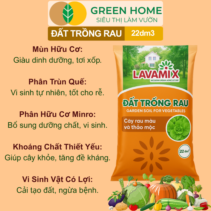 Đất Trồng Rau Greenhome, Bao 22dm3 (11kg), Hữu Cơ, Tiện Lợi Đầy Đủ Dinh Dưỡng Cho Các Loại Rau, Củ
