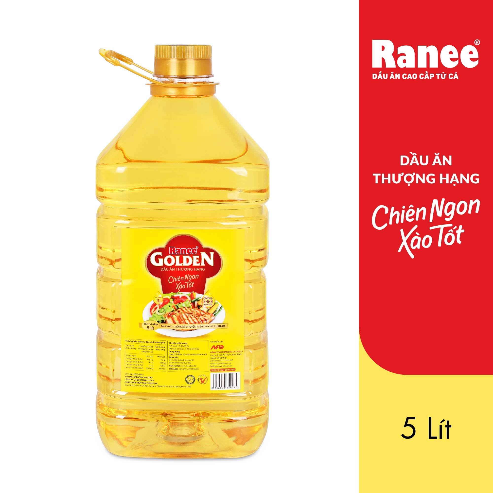 Dầu ăn thượng hạng Ranee Golden CHIÊN NGON XÀO TỐT Thành phần: + Dầu cá tinh luyện và dầu nành tinh luyện + Omega 3-6-9 và