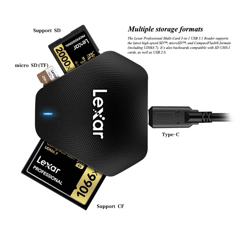 - TƯƠNG THÍCH VỚI CÁC CHUẨN USB 3.1, 3.0, 2.0 Được thiết kế với giao tiếp USB 3.1, đầu đọc thẻ 3 trong 1 Lexar cũng tương thích với cổng USB 2.0.