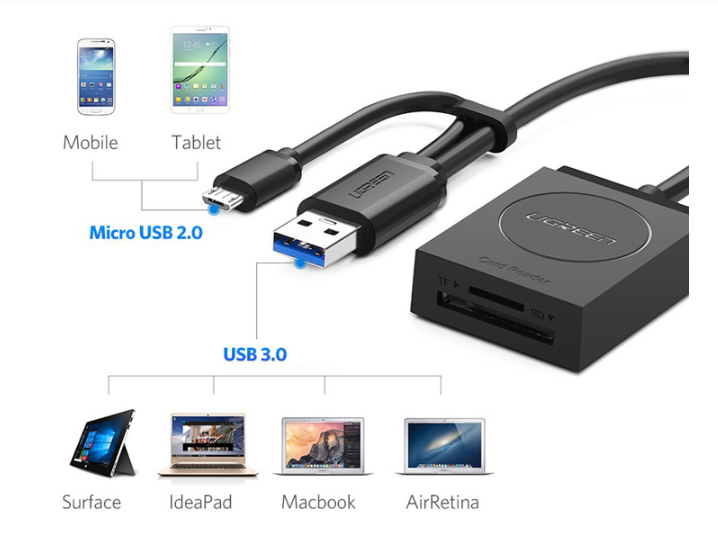 - Đầu đọc thẻ nhớ USB 3.0 Ugreen 20203 Cắm và chạy, không phải cài đặt phần mềm. Đầu đọc thẻ này hỗ trợ các thiết bị có OTG – dung lượng cho Windows 10/8/7 / Vista, Linux hoặc Mac OS X 10 2 và tất cả các ứng dụng Android. Cáp micro-USB tích hợp, dữ liệu được truyền trực tiếp từ thẻ nhớ vào thiết bị Andriod của bạn. Thông Số Kỹ Thuật Ugreen 20203