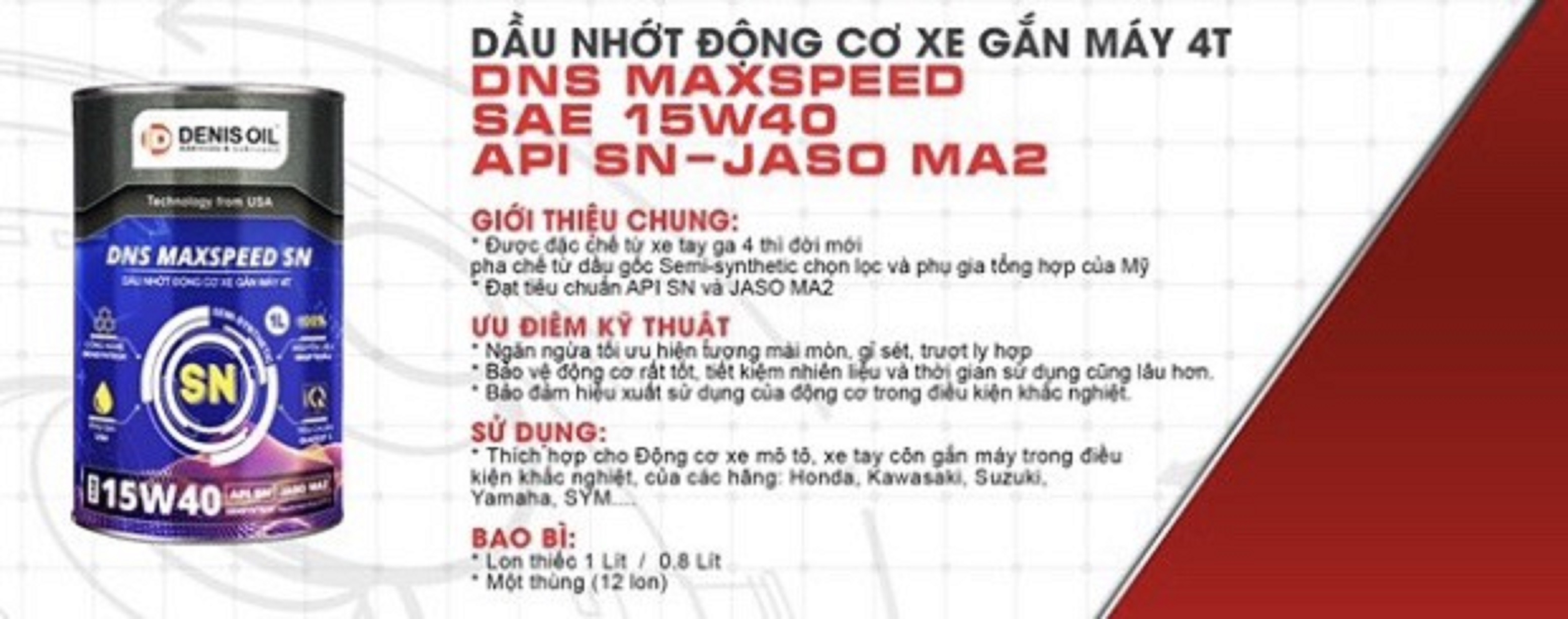 Giới thiệu Được đặc chế từ dầu gốc Semi-synthetic chọn lọc và phụ gia tổng hợp của Mỹ. Sản phẩm được áp dụng công nghệ Densyntech tăng sức mạnh động cơ tối ưu. Ưu điểm - Bảo vệ tối ưu cho động cơ, hộp số, ly hợp. - Đặc tính chống mài mòn nổi bật. - Duy trì động cơ sạch sẽ. - Tối đa công suất động cơ, máy chạy êm tiết kiệm nhiên liệu và kéo dài tuổi thọ Ứng dụng Thích hợp cho Động cơ mô tô xe gắn máy tốc độ cao hoạt động trong điều kiện khắc nghiệt, của các hãng: Honda, Kawasaki, Suzuki, Yamaha, SYM Tiêu chuẩn Đáp ứng API SN - SAE 15W40 ( Hoa kỳ ) và JASO MA2 - SAE 15W40 ( Nhật bản ). Bảo quản, an toàn sử dụng An toàn sử dụng: Vui long đọc MSDS trước khi sử dụng, giữ cách xa tầm tay trẻ em. Hạn chế để da tiếp xúc cũng như hít vào hơi sương dầu nhớt. Rửa sạch tay bằng xà phòng và nước sạch ngay sau khi sử dụng. Tránh xa nguồn nhiệt, tia lửa và ngọn lửa, kể cả đối với bình rỗng. Tránh đổ nhớt xuống cống rãnh và sông hồ. Các thông tin được giữ kín là bí mật thương mại. Bảo quản và vận chuyển: Vận chuyển bằng phương tiện có mái che và để theo chiều đứng của sản phẩm. Tồn trữ nơi khô ráo thoáng mát. Bao bì lon thiếc 1 lít - 1 thùng 12 lon Denis oil xin cam kết hoàn toàn 100% nếu phát hiện hàng giả . #daunhot#denis#daunhotdenis#hangnhapkhaumy#daunhotmynhapkhau#dau_nhot#daunhotxemay#daunhotxega#daunhototo