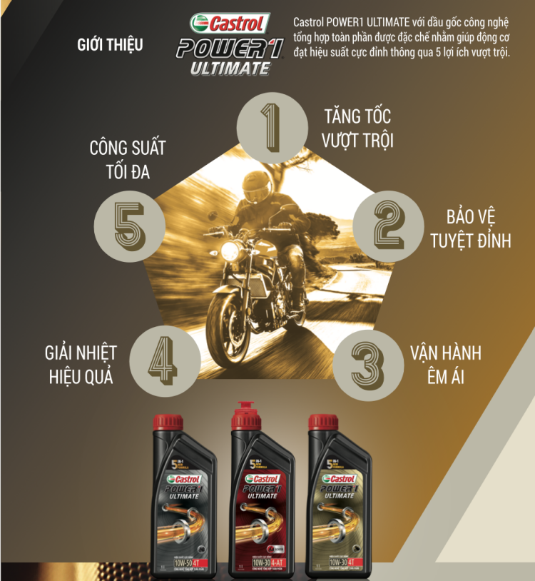 Dầu động cơ công nghệ tổng hợp toàn phần Castrol POWER1 ULTIMATE với công thức 5 trong 1 giúp: