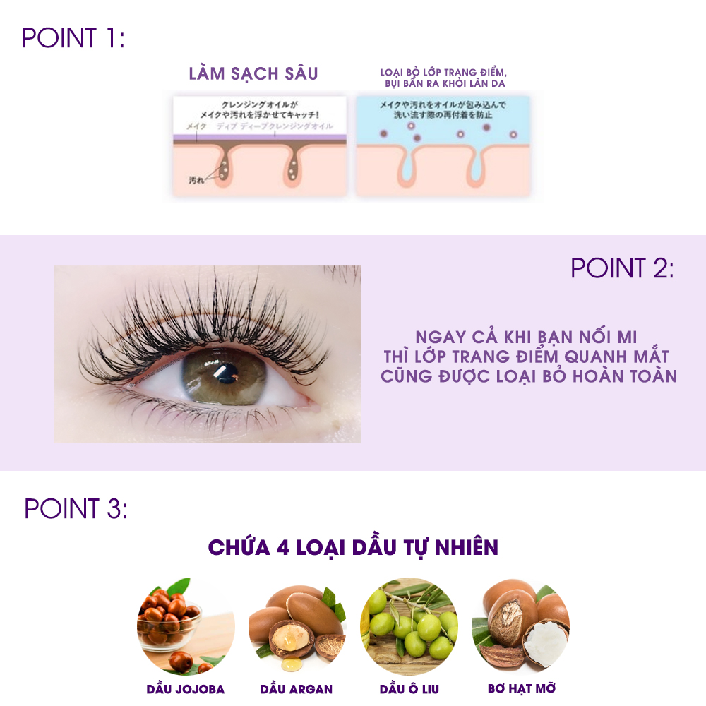 Công Dụng: Dầu tẩy trang giúp làm sạch sâu lớp trang điểm, làm sạch bụi bẩn và bã nhờn trên da. Cung cấp độ ẩm dưỡng da mịn màng hơn.