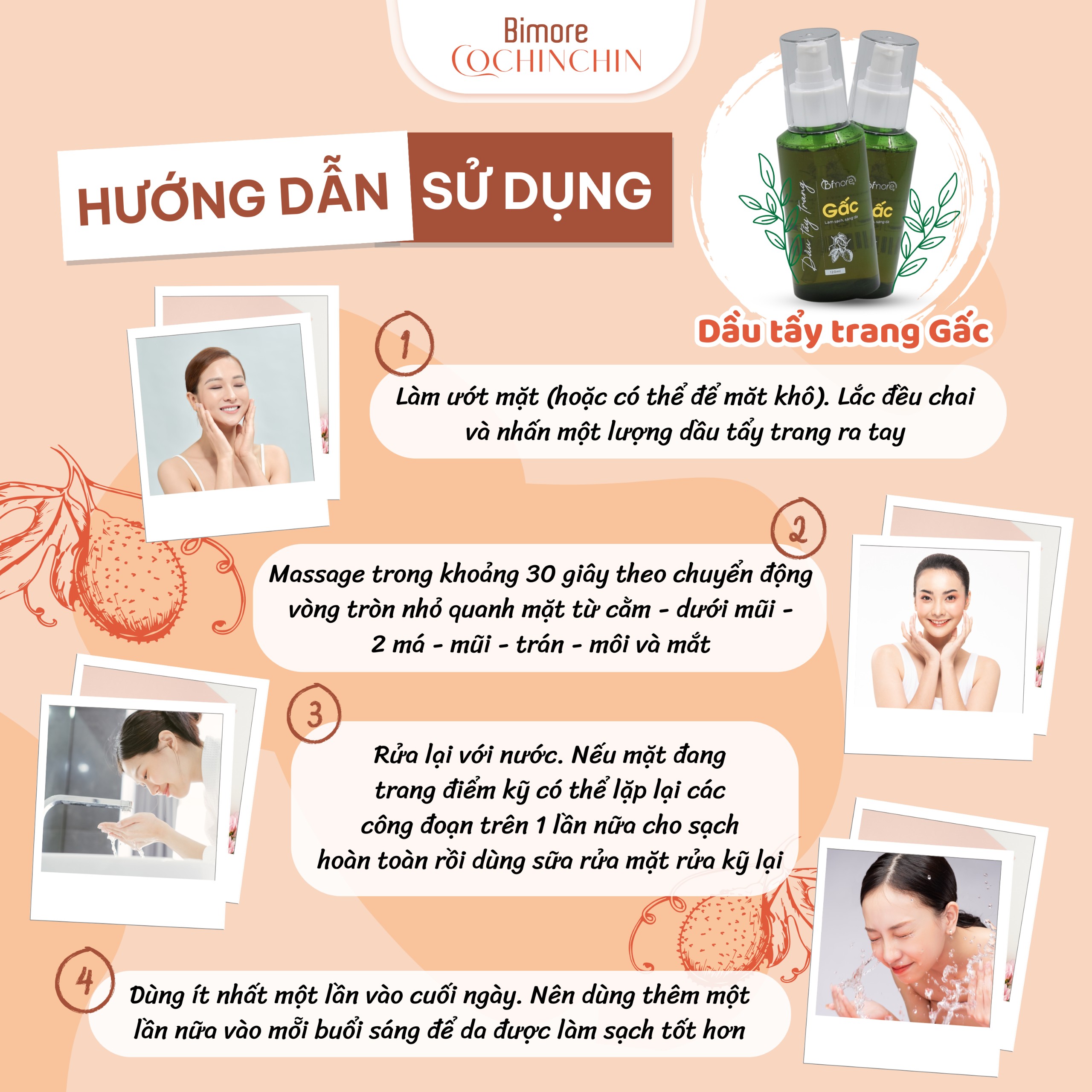 DẦU TẨY TRANG GẤC BIMORE Số CB: 065/19/CBMP-LA Thành phần dầu tẩy trang Gấc BiMore: Oryza Sativa Bran Oil (Dầu cám gạo) Momordica Cochinchinensis Seed Aril Oil (Dầu gấc) Argania Spinosa Kernel Oil (Dầu argan) Sesamum Indicum Seed Oil (Dầu hạt mè) Vitis Vinifera Seed Oil (Dầu hạt nho) Sorbitan Sesquioleate (Nhũ hóa) Ricinus Communis Seed Oil (Dầu castor) Tocopheryl acetate (Vitamin E) Cymbopogon schoenanthus Oil td (Tinh dầu cỏ tranh) Hướng dẫn sử dụng dầu tẩy trang Gấc BiMore:
