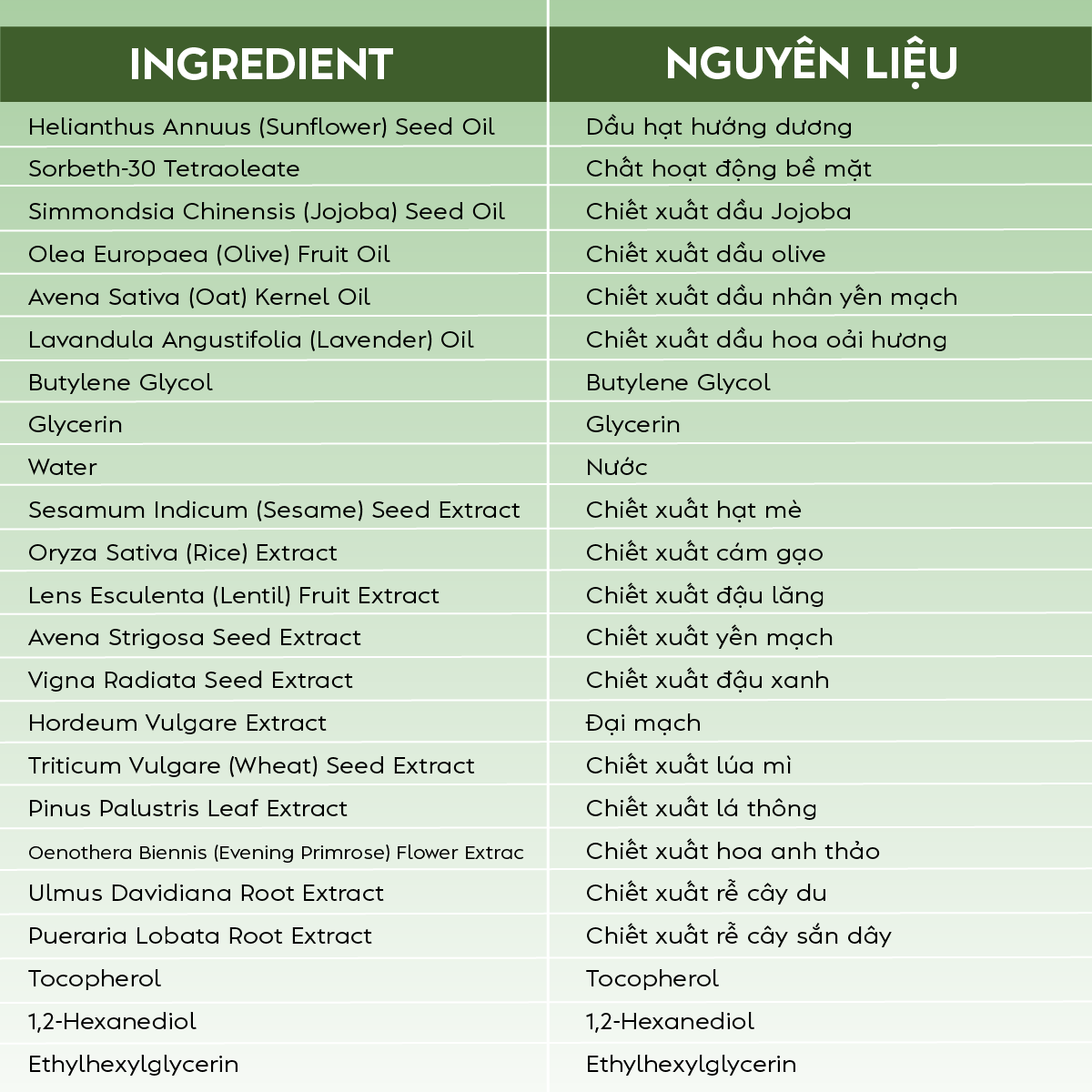 Dầu tẩy trang làm sạch sâu Lassie'el 20ml chiết xuất từ thiên nhiên lành tính dưỡng ẩm ml Hàn QuốcDầu tẩy trang Lassie'el với 93% thành phần chiết xuất từ thiên nhiên như dầu tự nhiên từ 7 loại ngũ cốc giúp loại bỏ cặn trang điểm, dầu nhờn, bụi bẩn trên da một cách nhẹ nhàng, không gây khô rát, không kích ứng cho da. Sản phẩm đã hoàn thành 6 loại kiểm nghiệm lâm sàn & đạt chứng nhận EWG, an toàn cho da nhạy cảm ❍ THÔNG TIN MÔ TẢ SẢN PHẨM Ⓛ CÔNG DỤNG ● Làm sạch cặn trang điểm, dầu nhờn, tạp chất ● Nhũ hóa nhanh chóng trong ● Loại bỏ mụn đầu trắng, mụn đầu đen ● Hỗ trợ dưỡng ẩm, mềm mịn da ● Hỗ trợ tẩy tế bào c h ế t (kết hợp cùng bột rửa mặt Lassie’el) Ⓛ NGUỒN KIỂM NGHIỆM (HÀN QUỐC) ● Trung tâm nghiên cứu lâm sàn da KC. ● Viện nghiên cứu da liễu Hàn Quốc Ⓛ THÀNH PHẦN CHÍNH ● Dầu hạt jojoba, dầu hoa oải hương, dầu hạt hướng dương, dầu nhân yến mạch, dầu olive: làm sạch tạp chất nhẹ nhàng lấy đi lớp make up, không gây khô căng da sau khi tẩy trang ● Ngũ cốc thiên nhiên (gạo, đậu xanh, đậu lăng, vừng, yến mạch, đại mạch, lúa mì): giúp làm sạch sâu, dưỡng ẩm da mà không gây kích ứng ● 1,2-Hexanediol: duy trì độ ẩm cho làn da, khiến da trở nên mềm mịn hơn đồng thời hạn chế tình trạng mất nước qua da ● Tocopherol: chống lão hóa, tăng tính ổn định Ⓛ THÀNH PHẦN CHI TIẾT Vui lòng xem trên bao bì sản phẩm Ⓛ KẾT CẤU SẢN PHẨM Dạng dầu Ⓛ CHỈ ĐỊNH SỬ DỤNG Dùng được cho mọi loại da kể cả da nhạy cảm Không gây kích ứng (đã qua kiểm định) Ⓛ HƯỚNG DẪN SỬ DỤNG Bước 1: Rửa tay sạch và lau khô, lấy 1 lượng dầu tẩy trang vừa đủ vào lòng bàn tay (1-2 puml) Bước 2: Massage nhẹ nhàng trên từng khu vực của khuôn mặt Bước 3: Cho nước lên da tiến hành bước nhũ hóa để chuyển dầu thành dạng sữa trắng đục Bước 4: Rửa mặt lại với nước sạch cho đến khi nước trong Ⓛ HƯỚNG DẪN BẢO QUẢN Nhiệt độ phòng, tránh tiếp xúc trực tiếp với ánh nắng mặt trời Ⓛ XUẤT XỨ    : HÀN QUỐC Ⓛ DUNG TÍCH: 20ml Ⓛ HSD             : 36 tháng kể từ NSX Ⓛ NSX             : Xem trên bao bì ❍ THÔNG TIN THƯƠNG HIỆU Thương hiệu Lassie'el thuộc sở hữu công ty BEUKAY KOREA CO.,LTD ( một trong những đối tác sản xuất trực tiếp cho tập đoàn L'Oreal). Hiện sản phẩm của thương hiệu Lassie'el đang được phân phối rộng rãi tại các chuỗi hệ thống Hàn Quốc (Olive Young) & định hướng phát triển trên toàn cầu Bằng những chuyển động thầm lặng nhưng vô cùng nghiêm túc và sự biết ơn đến những nguyên liệu tốt có được từ thiên nhiên, Lassie’el đã tạo nên những sản phẩm mà ngay từ lần đầu sử dụng bạn sẽ cảm nhận rõ ràng sự thanh lọc, chữa lành Chọn Lassie’el chọn an tâm và thầm lặng khởi đầu cho sự chung sống hài hòa giữa con người và thiên nhiên Lassie’el xin chân thành cảm ơn bạn đã quan tâm đến sản phẩm: Dầu tẩy trang làm sạch sâu Lassie'el 20ml chiết xuất từ thiên nhiên lành tính dưỡng ẩm