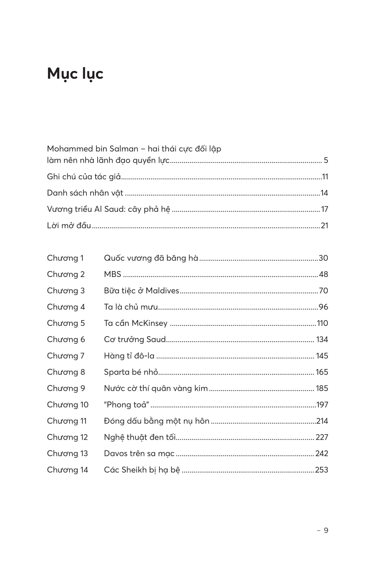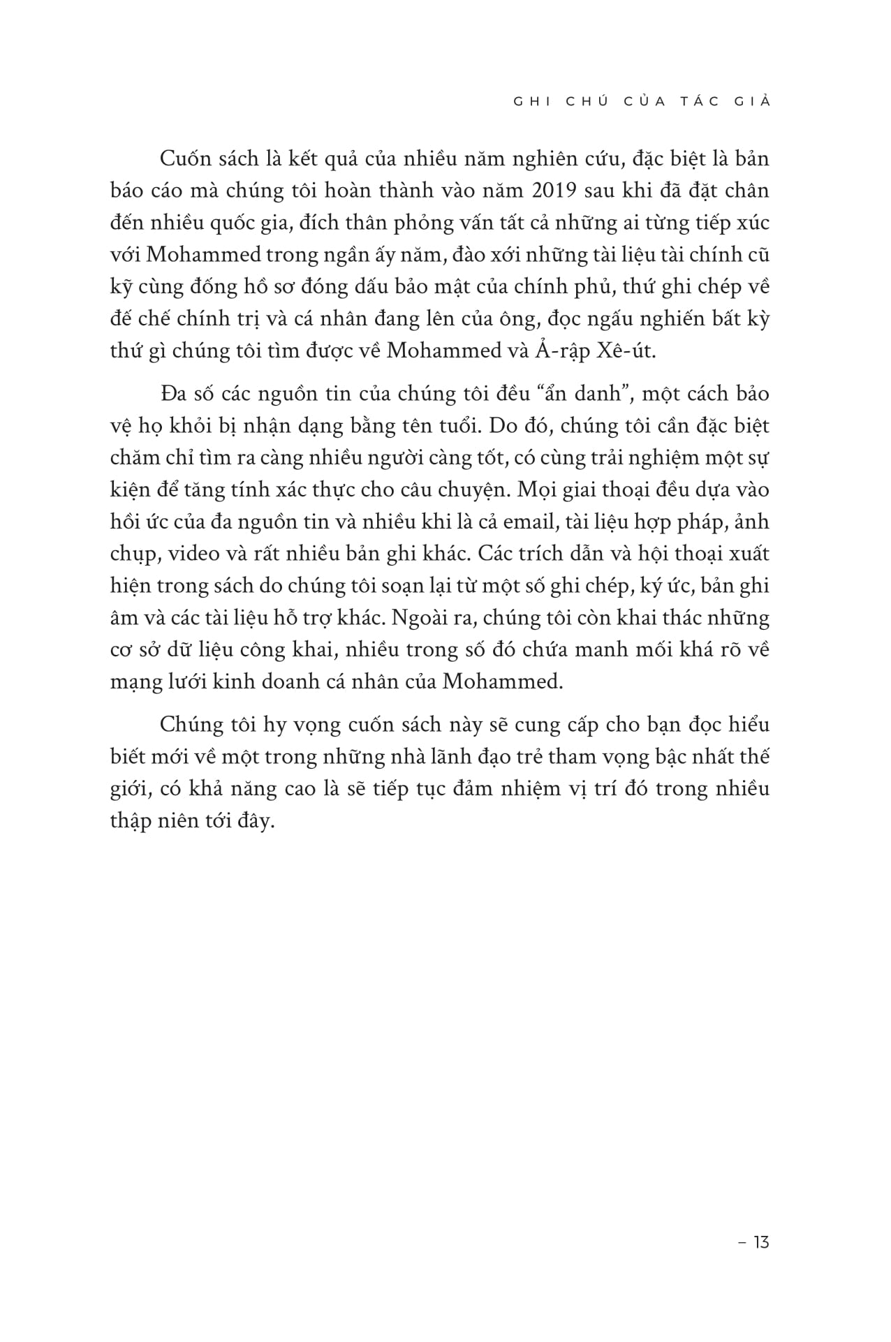 Từ những khoản đầu tư khổng lồ vào công nghệ; sử dụng dầu mỏ như một vũ khí kinh tế; cho đến những cải cách mạnh mẽ trong nước... Cuốn sách đã cung cấp cái nhìn về sự nổi lên của Thủ tướng, Thái tử Mohammed Bin Salman. Điều gì đã đưa vị thái tử sinh năm 1985 không chỉ nhanh chóng nắm bắt quyền lực tại Ả-rập Xê-út, mà giờ đây đã trở thành một trong những nhân vật chính trị và kinh tế quan trọng nhất thế giới? Nội dung cuốn sách vẫn còn có những điều gây tranh cãi. Nhưng đây là tác phẩm không thể thiếu cho những ai muốn hiểu rõ hơn về sức mạnh, sự tham vọng, và tương lai của Ả-rập Xê-út dưới thời Mohammed Bin Salman.