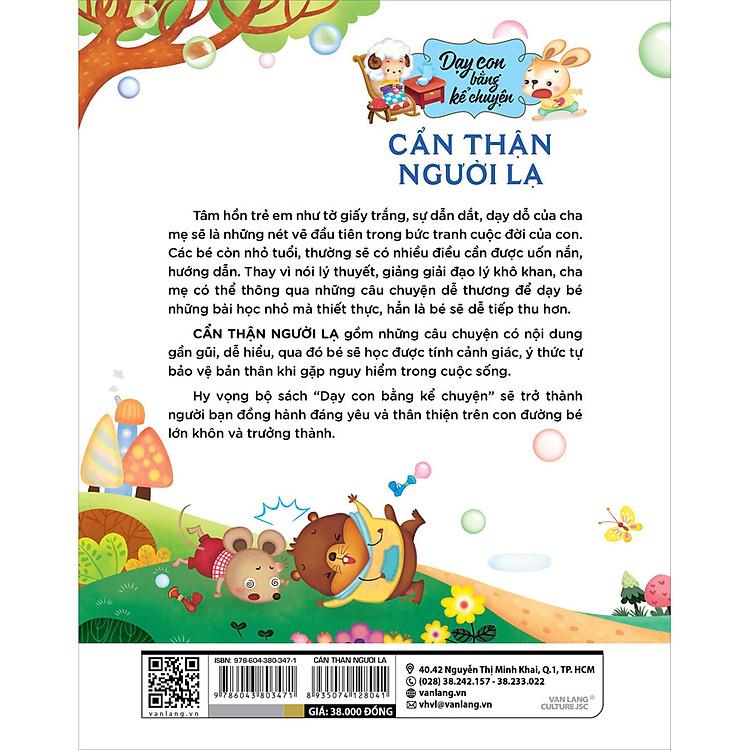 Tâm hồn trẻ em như tờ giấy trắng, sự dẫn dắt, dạy dỗ của cha mẹ sẽ là những nét vẽ đầu tiên trong bức tranh cuộc đời của con. Các bé còn nhỏ tuổi, thường sẽ có nhiều điều cần được uốn nắn, hướng dẫn. Thay vì nói lý thuyết, giảng giải đạo lý khô khan, cha mẹ có thể thông qua những câu chuyện dễ thương để dạy bé những bài học nhỏ mà thiết thực, hẳn là bé sẽ dễ tiếp thu hơn.CẨN THẬN NGƯỜI LẠ gồm những câu chuyện có nội dung gần gũi, dễ hiểu, qua đó bé sẽ học được tính cảnh giác, ý thức tự bảo vệ bản thân khi gặp nguy hiểm trong cuộc sống.Hy vọng bộ sách “Dạy con bằng kể chuyện” sẽ trở thành người bạn đồng hành đáng yêu và thân thiện trên con đường bé lớn khôn và trưởng thành.