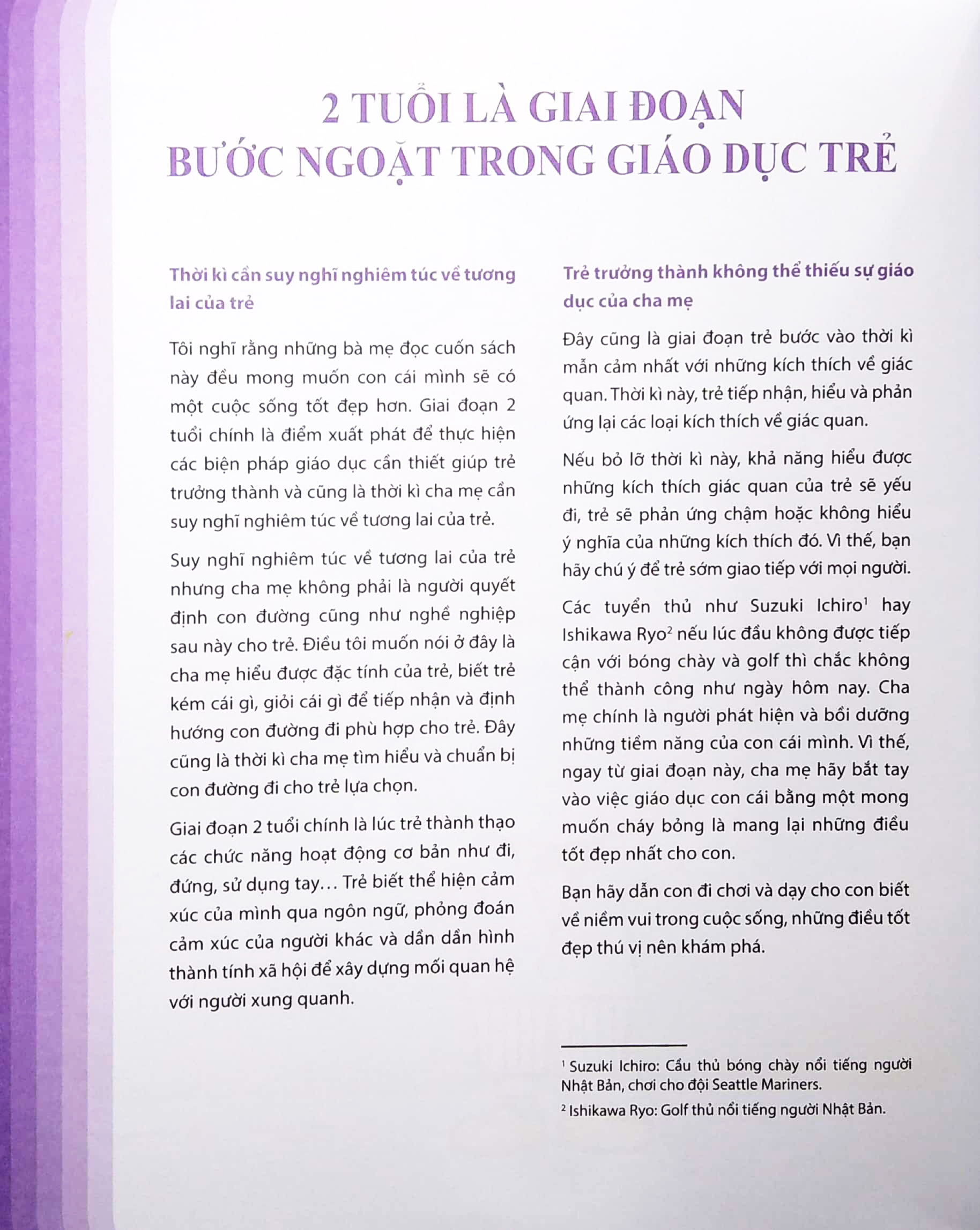 Hiện nay, các bậc phụ huynh thường quan tâm tới vấn đề giáo dục cho trẻ từ rất sớm. Năm hai tuổi được xem là độ tuổi có ảnh hưởng rất lớn tới việc hình thành tính cách trẻ và đây cũng là giai đoạn bộ não của trẻ quyết định độ lớn của nó sau này. Giai đoạn hai tuổi là lúc trẻ đã hoàn thiện các kĩ năng đi đứng, nhận thức về thế giới xung quanh. Vì vậy, đây là thời điểm để cho trẻ tập tính xã hội. So với các bà mẹ, thì các ông bố sẽ làm điều này tốt hơn. Tuy nhiên một điều đáng nói là ngày nay quá nhiều các ông bố vì bận rộn với công việc mà phó thác chăm sóc cũng như dạy dỗ con cái cho các bà vợ. Điều này đang khiến cho số lượng trẻ không có tính xã hội tăng lên. Đây là một giai đoạn quan trọng và cũng là một giai đoạn khó khăn với các bậc cha mẹ vì giai đoạn này trẻ khá bướng bỉnh. Những hãy kiên nhẫn, vì nếu như giáo dục tốt, những tố chất của trẻ sẽ được phát huy.