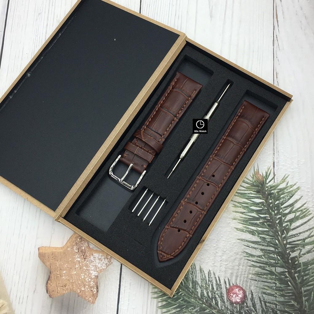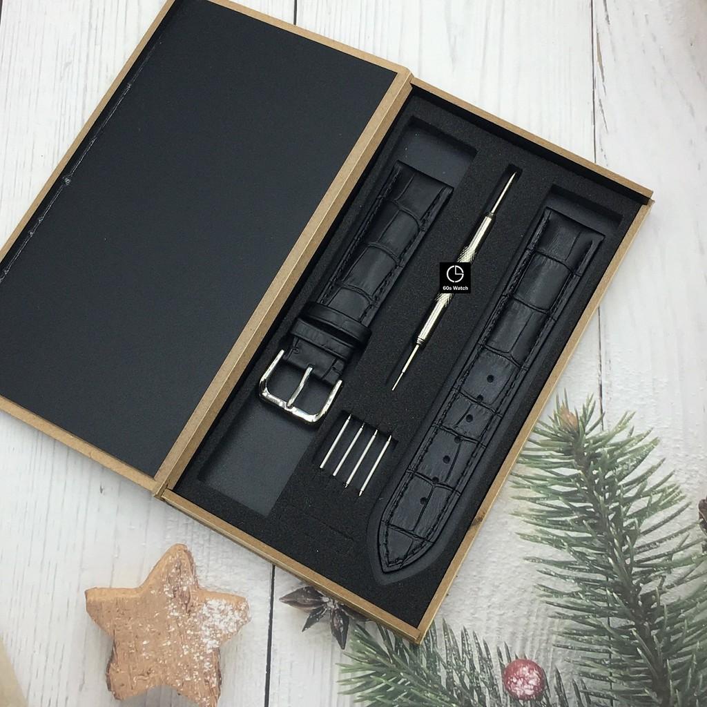 Dây đồng hồ nam da bò dập vân cá sấu chống thấm hút mồ hôi, hộp gỗ tặng kèm phụ kiện - D2108