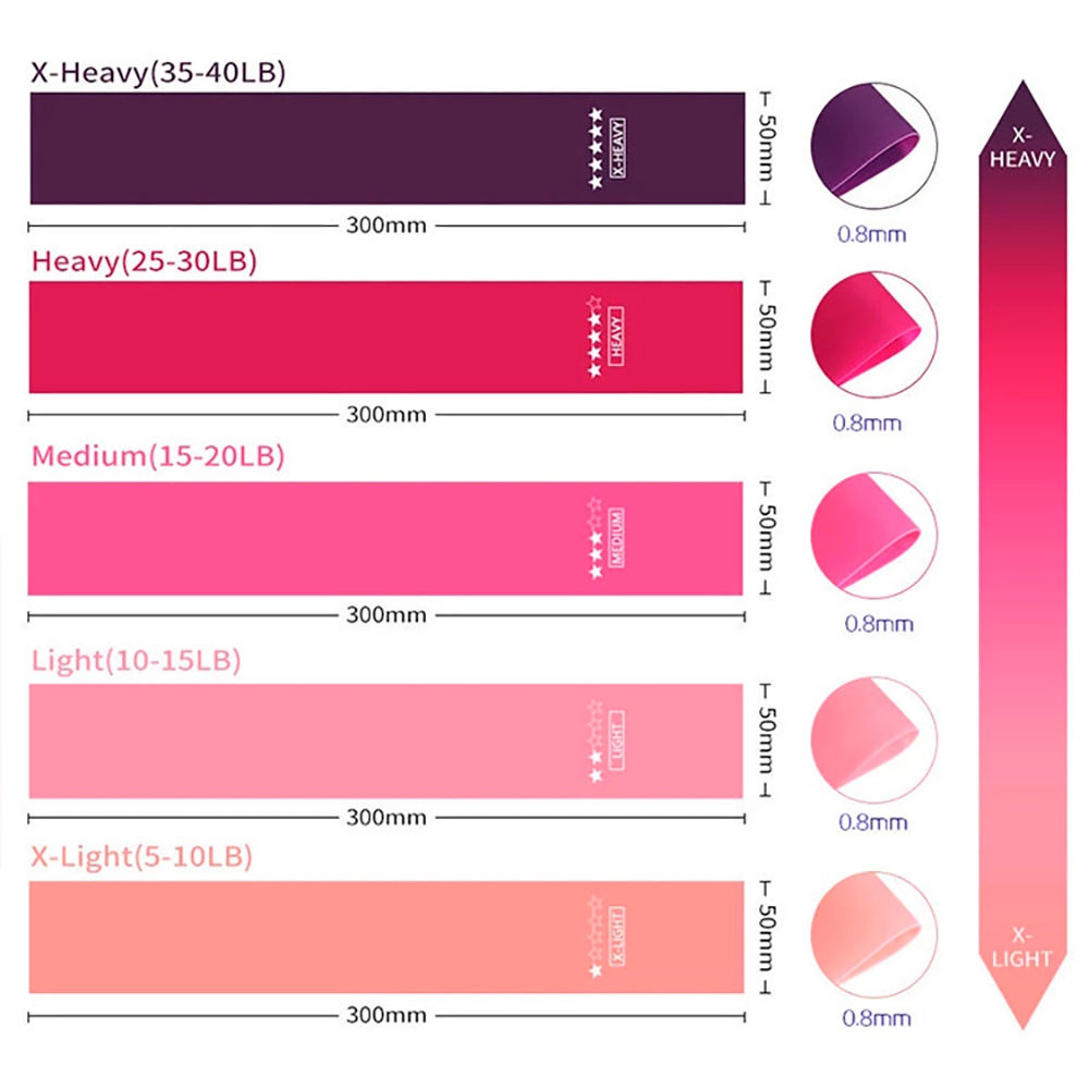 Bộ dây đàn hồi tập thể lực có 5 dây, mỗi dây có mức trọng lượng khác nhau, từ nhẹ tới nặng (8 lbs, 15 lbs, 20 lbs, 25 lbs, 30 lbs) có thể