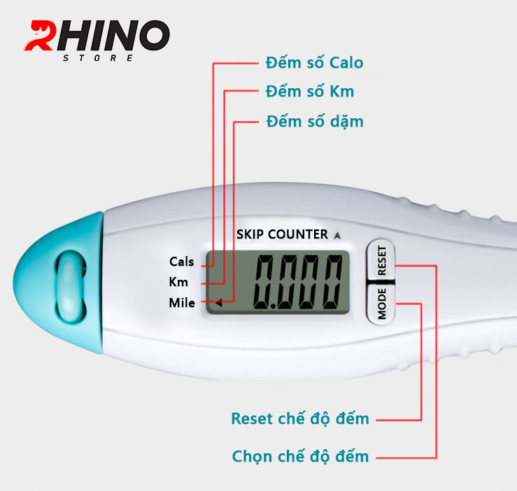 Chất liệu dây: PVC bọc dây cáp thép, chống nước, cách điện, độ bền cao Dây nhảy thể thao lõi thép cao cấp Rhino J601 tự động đếm số, đếm giờ, tích hợp đo calo,