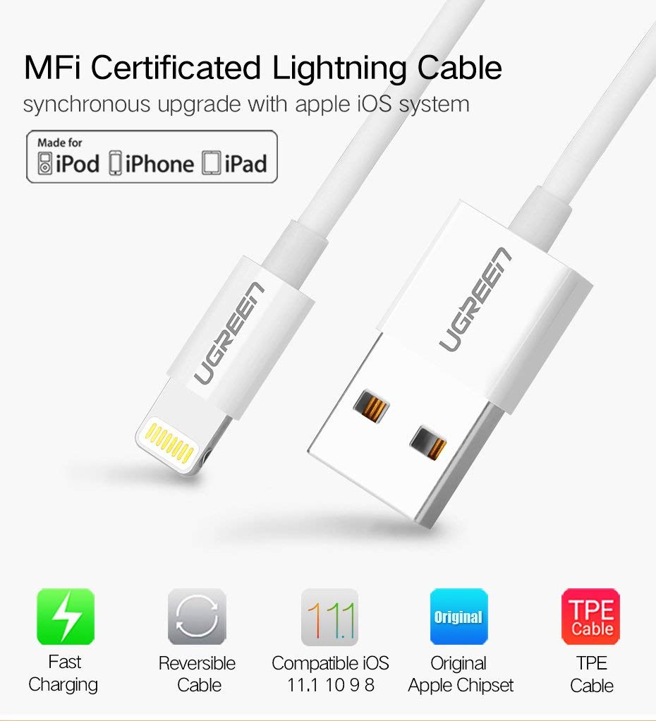 Dây USB lighting dài 1m có chip mFI cao cấp UGREEN 20728 Giá 230k