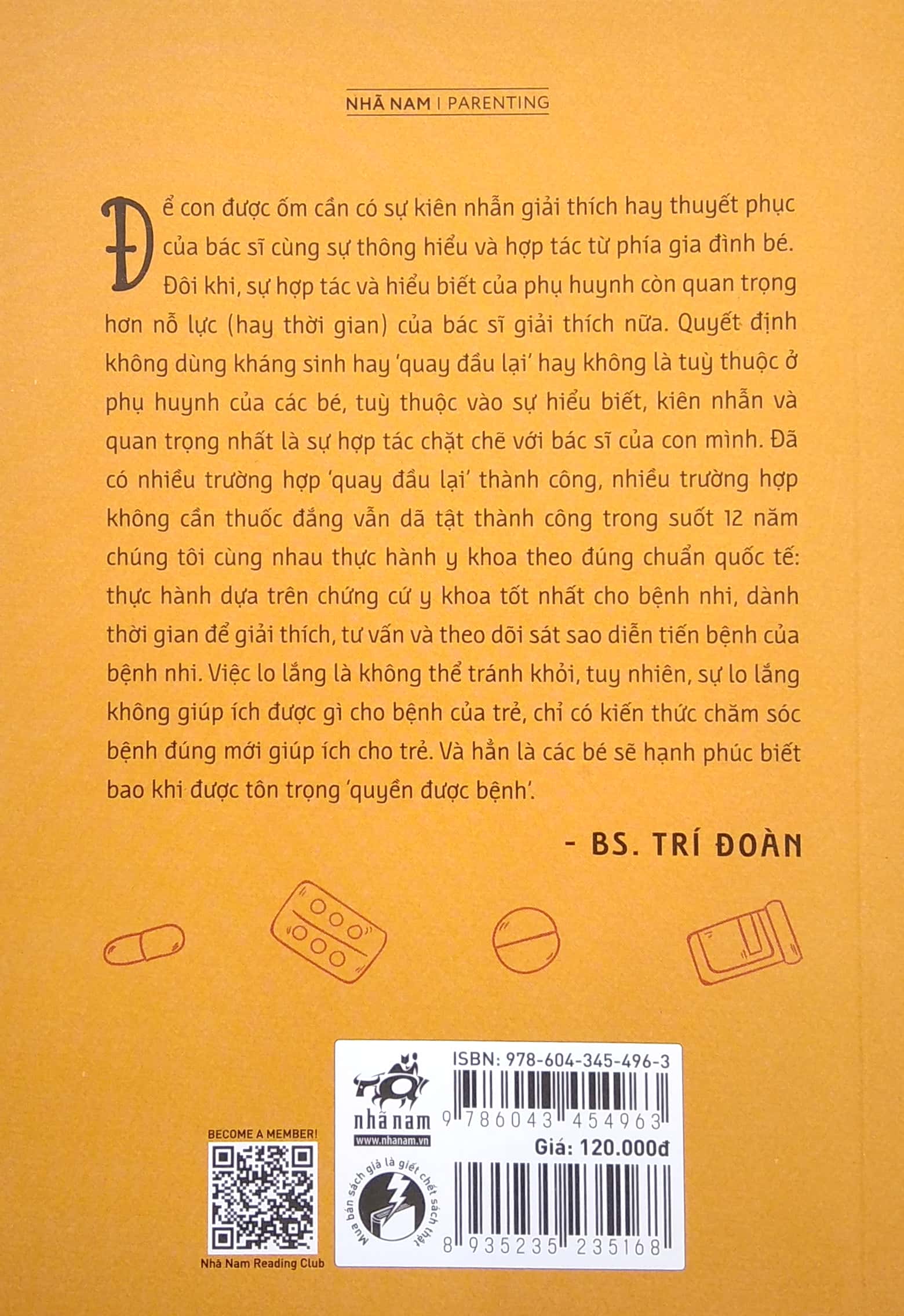 “Để con được ốm cần có sự kiên nhẫn giải thích hay thuyết phục của bác sĩ cùng sự thông hiểu và hợp tác từ phía gia đình bé. Đôi khi, sự hợp tác và hiểu biết của phụ huynh còn quan trọng hơn nỗ lực (hay thời gian) của bác sĩ giải thích nữa. Quyết định không dùng kháng sinh hay ‘quay đầu lại’ hay không là tuỳ thuộc ở phụ huynh của các bé, tuỳ thuộc vào sự hiểu biết, kiên nhẫn và quan trọng nhất là sự hợp tác chặt chẽ với bác sĩ của con mình. Đã có nhiều trường hợp ‘quay đầu lại’ thành công, nhiều trường hợp không cần thuốc đắng vẫn dã tật thành công trong suốt 12 năm chúng tôi cùng nhau thực hành y khoa theo đúng chuẩn quốc tế: thực hành dựa trên chứng cứ y khoa tốt nhất cho bệnh nhi, dành thời gian để giải thích, tư vấn và theo dõi sát sao diễn tiến bệnh của bệnh nhi. Việc lo lắng là không thể tránh khỏi, tuy nhiên, sự lo lắng không giúp ích được gì cho bệnh của trẻ, chỉ có kiến thức chăm sóc bệnh đúng mới giúp ích cho trẻ. Và hẳn là các bé sẽ hạnh phúc biết bao khi được tôn trọng ‘quyền được bệnh’.