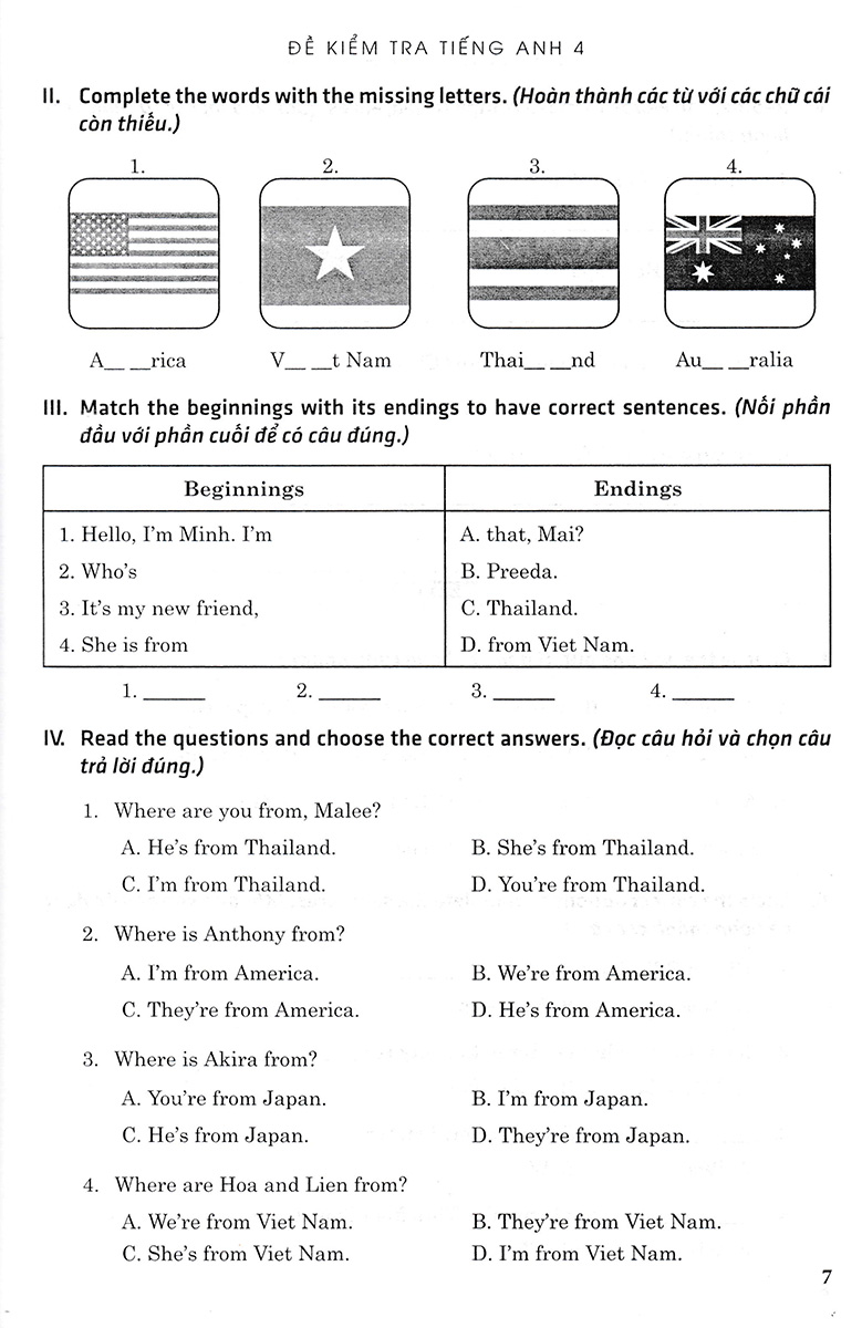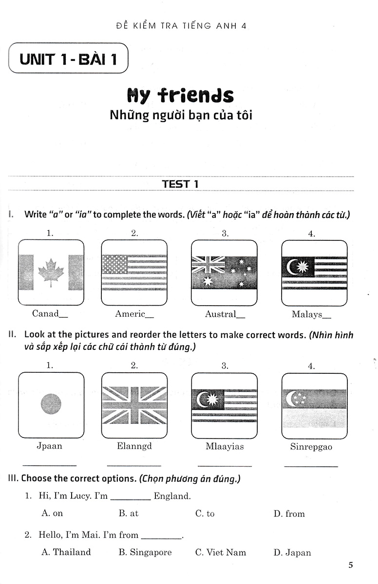 Cuốn sách “Đề kiểm tra Tiếng Anh 4” là một tài liệu cần thiết cho các em trong việc ôn tập và củng cố kiến thức để chuẩn bị cho các bài kiểm tra đánh giá thường xuyên và các bài kiểm tra, cuối kì môn Tiếng Anh lớp 4.