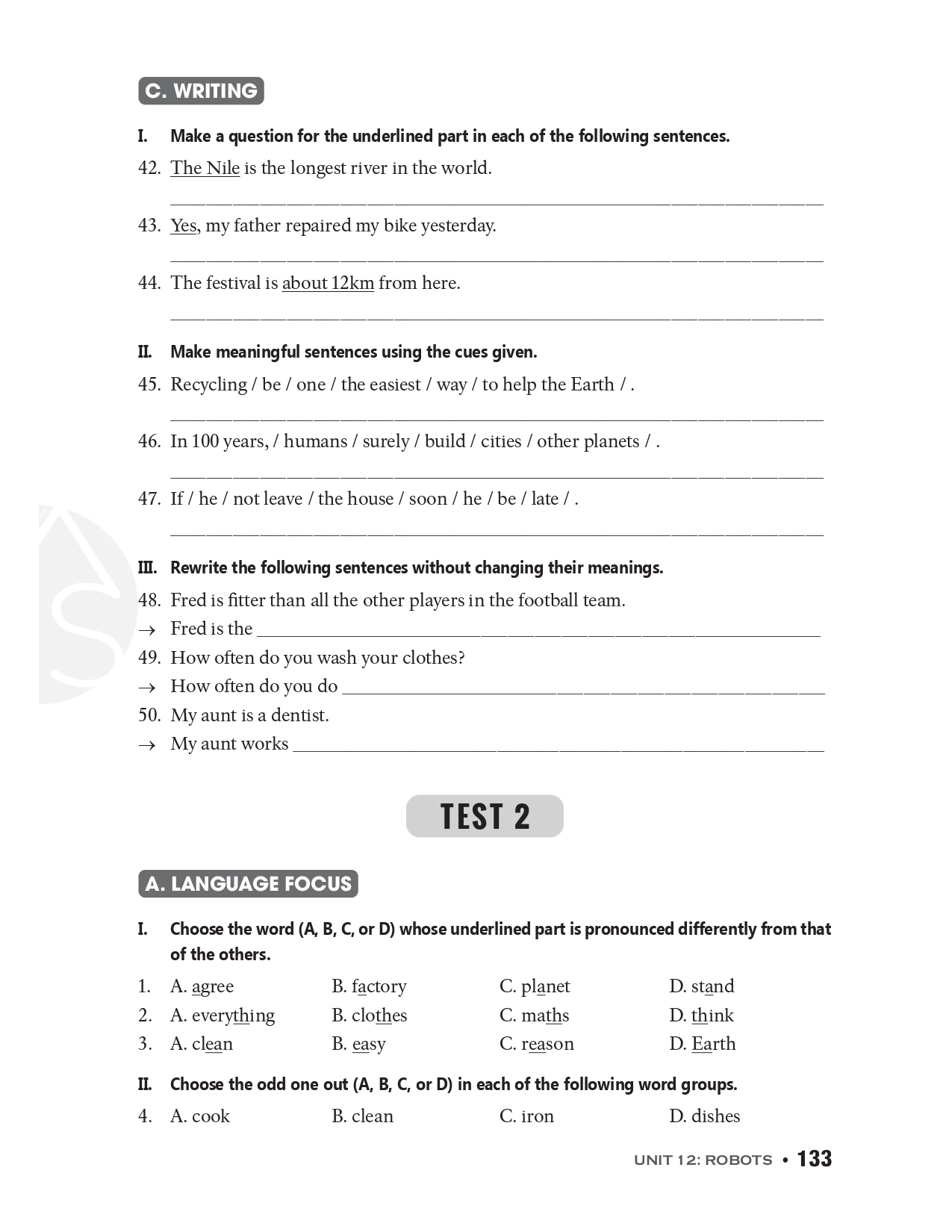 24 đề kiểm tra (Tests) tương ứng với 12 đơn vị bài học trong sách giáo khoa: củng cố kiến thức của từng đơn vị bài học, giúp học sinh chuẩn bị cho bài kiểm tra 15 phút.