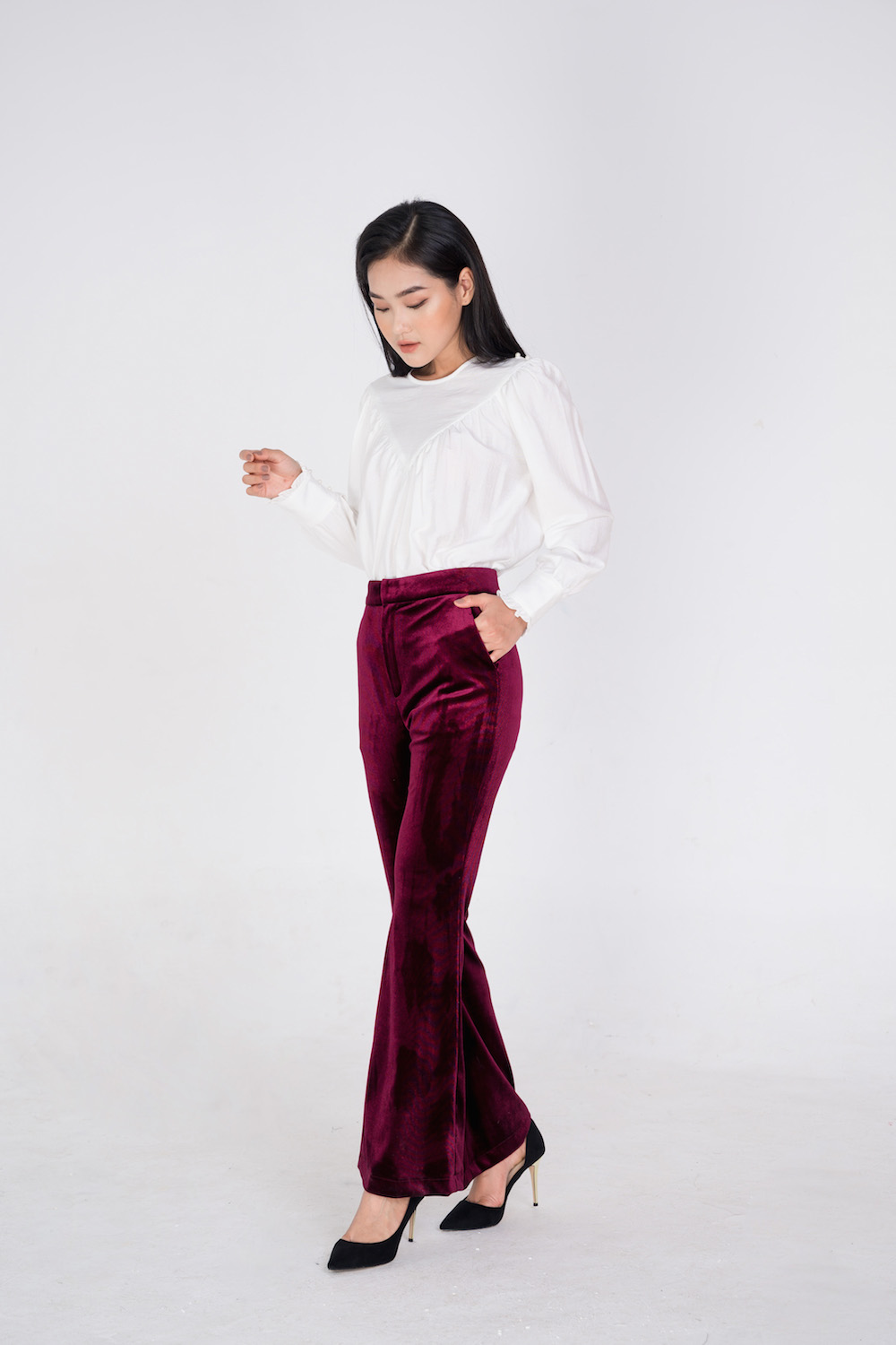 Áo dáng suông, với phần cổ cách điệu được nhún li ngực tạo phom suông rộng trẻ trung. Áo với điểm nhấn là hàng khuy trai 1 bên vài và tay bo kẹp bèo nhí
