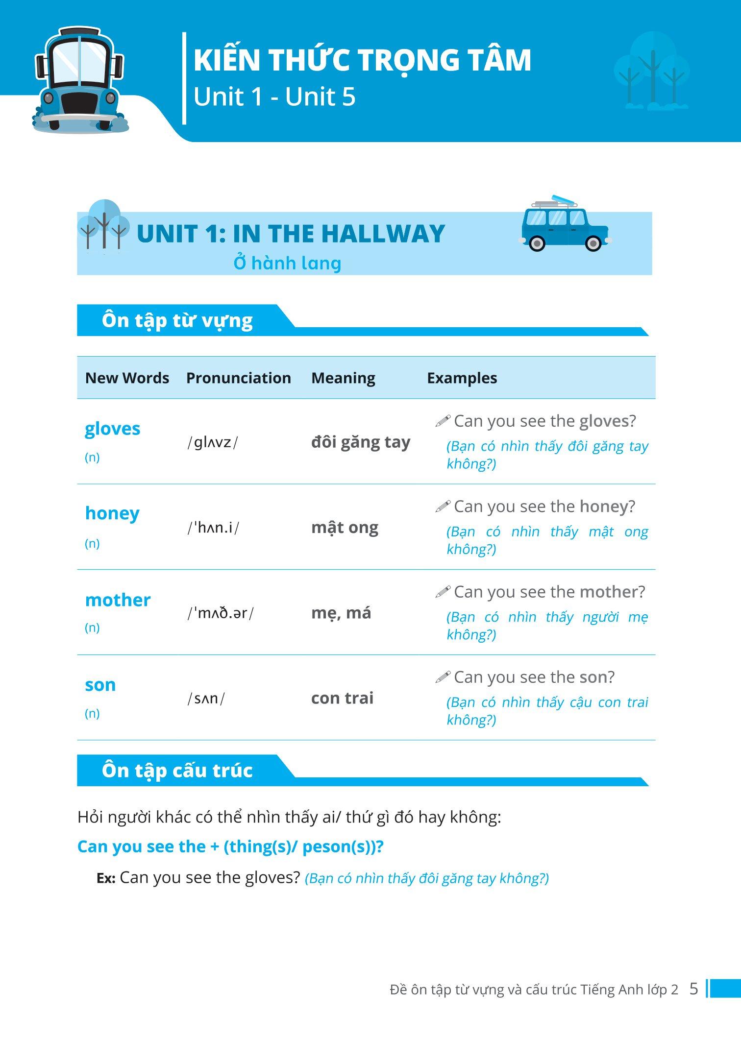 - Sách tổng hợp kiến thức trọng tâm về cả cấu trúc và từ vựng ÔN TẬP CẤU TRÚC: Giới thiệu những mẫu câu theo chủ đề bài học kèm ví dụ cụ thể để các em dễ dàng ghi nhớ và vận dụng đúng ngữ pháp. ÔN TẬP TỪ VỰNG: Tổng hợp lại những từ vựng trong bài học, kèm theo đó là cách phát âm, dịch nghĩa cùng câu ví dụ giúp các em ghi nhớ lâu và toàn diện.